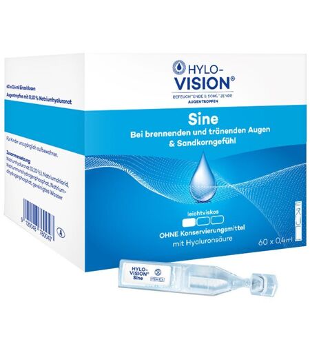 HYLO-VISION® Sine Augentropfen werden zur Linderung von brennenden, tränenden Augen und dem sogenannten Sandkorngefühl angewendet. Sie eignen sich besonders für Personen, die unter trockenen Augen leiden, verursacht durch Bildschirmarbeit, Kontaktlinsen oder Umweltreize wie trockene Raumluft. Anwendung Träufeln Sie 1 bis 2 Tropfen HYLO-VISION® Sine in den Bindehautsack jedes Auges. Die Anwendung kann nach Bedarf erfolgen. Bei der Verwendung mit Kontaktlinsen sollten die Tropfen auf die Kontaktlinsen aufgebracht werden, bevor sie eingesetzt werden. Die Augentropfen können auch während des Tragens von Kontaktlinsen angewendet werden. Nach dem Öffnen ist das Ein-Dosis-Behältnis noch 12 Stunden verwendbar. Zusammensetzung HYLO-VISION® Sine enthält 0,1 % Hyaluronsäure. Die Augentropfen sind leichtviskos, frei von Konservierungsmitteln und gut verträglich. Weitere Bestandteile sind: Hyaluronsäure Wasser Hilfsstoffe zur Stabilisierung der Lösung ...