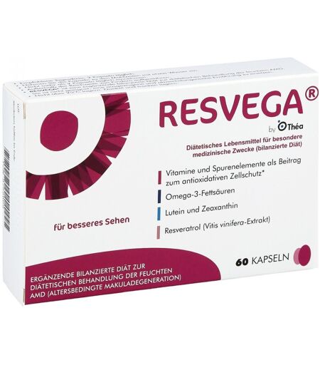 Anwendungsgebiet von Resvega KapselnResvega Kapseln ist ein Nahrungsergänzungsmittel zur Unterstützung der Sehkraft mit antioxidativ wirkenden Vitaminen und Spurenelementen, Omega-3-Fettsäuren, Lutein und Zeaxanthin, trans-Resveratrol und Vitamin 3. Zink, Kupfer, Vitamin E und Vitamin C unterstützen die Zellen sich vor oxidativem Stress zu schützen. Resvega Kapseln ist frei von Lactose und Gluten.Wirkstoffe / Inhaltsstoffe / ZutatenInhaltsstoffe von Resvega Kapseln: Fischöl (essentielle Omega-3-Fettsäuren) Wasser Vitamin C (Ascorbinsäure) Feuchthaltemittel: Glycerin, Sorbit Emulgator: Glycerylmonostearat trans-Resveratrol Lutein- Suspension in Safloröl Vitamin E (DL-Tocopherylacetat) Trennmittel: Bienenwachs, Emulgator: Sojalecithin Zinkoxid Zeaxanthin-Suspension in Safloröl Kupfersulfat Farbstoffe: schwarzes Eisenoxid, rotes Eisenoxid Vitamin D3 (Cholecalciferol). Nährwertangaben Zusammensetzung Tagesdosis 2 Kapseln: Vitamin C: 120 mg (150 %*) Vitamin D: 5 µg (100 %*) Vitamin E: 30 mg α-TE (250 %*) Zink: 12,5 mg (125 %*) Kupfer: 1000 µg (100 %) Fischöl: 950 mg davon Omega-3-Fettsäuren: 606 mg - DHA: 366 mg - EPA: 172 mg Lutein: 10 mg Zeaxanthin: 2mg trans-Resveratrol: 60 mg *NRV: Nährstoffbezugswerte (nutrient reference values) gemäß VO (EU) Nr. 1169/2011.GegenanzeigenBei bekannter Überempfindlichkeit gegenüber einem der oben genannten Inhaltsstoffe sollte dieses Produkt nicht angewendet werden.DosierungAnwendungsempfehlung von Resvega Kapseln: Sie können von Resvega Kapseln jeden Tag 2 Kapseln einnehmen. Nehmen Sie diese am besten zu einer Mahlzeit mit ausreichend Flüssigkeit zu sich. Um eine Überdosierung zu vermeiden, sollte die angegebene Dosierung nicht überschritten werden. PatientenhinweiseWenn Sie Arzneimittel einnehmen, sollten Sie Resvega Kapseln nur unter ärztlicher Aufsicht verzehren. R ...