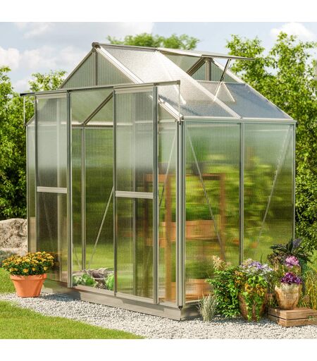 259 x 133 cm Gewächshaus, inkl. Aktionsset - XL 8 mm: Sie sind Hobbygärtner*in oder hegen den großen Traum von der Selbstversorgung? Mit diesem Hobby-Gewächshaus der Qualitätsmarke GFP in aluminium mit den Maßen 2,59x1,33m wird Ihr Wunsch zur Wirklichkeit! Die stabile Aluminium-Konstruktion – "Designed in Austria" – und die 6 bis 8 mm starken Doppelstegplatten aus Polycarbonat – "Made in Germany" – sorgen für einen witterungs-, wetter- sowie UV-beständigen Ganzjahreseinsatz. Dank der leichtgängigen, praktischen Doppelschiebetür und – je nach Modell – 1 bis 4 Dachfenstern ist für ausreichend Frischluftzufuhr gesorgt. Mit einem Gewicht von 8 mm, einer Breite von [product_width] und einer Höhe von 2,18 gilt das moderne Gewächshaus als robust. Profitieren Sie zudem von 15 Jahren Garantie auf den Aluminium-Rahmen und 10 Jahren Garantie auf die Doppelstegplatten. Sie sind Hobbygärtner oder möchten es gerne einmal werden? Dann darf dieses 2,59x1,33m große Hobby-Gewächshaus der Qualitätsmarke GFP nicht in Ihrem Garten fehlen! Mit einer Traufenhöhe von ca. [size_height_side] und einer Grundfläche von ca. 3.4447m² bietet dieses freistehende Gewächshaus ausreichend Platz für den Anbau Ihrer Pflanzen! Werden Sie zum Selbstversorger und pflanzen Sie Ihr eigenes Obst und Gemüse – und das, frei von Pestiziden und Giftstoffen! Das Hobby-Gewächshaus ist aber nicht nur das ideale Produkt zum Anbau und Ernten und somit für den Beginn eines neuen, nährstoffreichen Lebensstils, sondern es bietet Ihren Pflanzen ein wetterfestes Dach. Lichtdurchlässige Doppelstegplatten aus Polycarbonat lassen viel Sonnenlicht ins Gewächshaus eindringen und versorgen Ihre Pflanzen mit Wärme. Zusätzlich zeichnen sich die Platten durch ihre Robustheit, Langlebigkeit, guten Wärmedämmung und UV-Beständigkeit aus. Sie sind ca. 8 mm stark und ideal für den ganzjährigen Einsatz geeignet. Außerdem ist dieses Gewächshaus mit einer besonders stabilen Konstruktion ausgestattet. Diese besteht aus Aluminium und ist korrosionsbeständig. Das Firstprofil ist als Hohlkammerprofil ausgeformt und somit verwindungssteif und tragfähig zugleich. Dank der Verschraubung der First- und Dachecken via hochwertigen Zink-Druckgussverbindern können diese Wind- und Schneelasten effektiv aufnehmen. Die Hohlkammerprofile der Seiteneck- und Dacheckprofile sowie die Eckverbinder aus Zink-Druckguss sorgen zusätzlich für eine ausgezeichnete Stabilität. Integrierte Dachrinnen fangen zudem Regenwasser auf und Windverbände an allen Seiten dienen als Windschutz. Wichtige Aspekte, schließlich können Nässe und Feuchtigkeit das Wachstum Ihrer Pflanzen beeinträchtigen. Außerdem kann das durch die Dachrinne aufgefangene Regenwasser für die Bewässerung Ihres Obsts und Gemüses genutzt werden. Es handelt sich also um eine erstklassige, für den ganzjährigen Einsatz konzipierte Konstruktion, die Wind und Wetter trotzt! Die 1 Dachfenster inklusive praktischem Aufsteller gewährleisten einen ständigen Luftaustausch und sorgen so für... ...