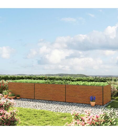 490 x 77 x 77 cm Hochbeet, Holzoptik: Ihrem Selbstversorger-Garten fehlt noch das gewisse Etwas, um Gurken, Kohlrabi und Radieschen optimale Wachstumsbedingungen zu bieten? Und auch Ihr Rücken schmerzt vom konventionellen Gärtnern? Wir haben die ideale Lösung! Mit diesem Kingsize-Hochbeet der Qualitätsmarke GFP in holzoptik und rechteckiger Form müssen Sie sich nicht mehr krumm machen. Das zeitgemäße Hochbeet weist eine Beethöhe von 0,77 und ein Gewicht von 22 mm auf und gilt als äußerst langlebig und wartungsfrei. Die robuste Aluminium-Konstruktion (ca. 22 mm starke Aluminiumplanken) – "Designed in Austria" – garantiert einen stabilen Stand und das zweckmäßige Stecksystem erleichtert den Aufbau. Erhältlich ist das Hochbeet in vier unterschiedlichen Breiten: ca. 77 cm, 99 cm, 119 cm oder 150 cm. Profitieren Sie zudem von 15 Jahren Garantie auf den Aluminium-Rahmen. Ihr eigenes Obst und Gemüse im Garten anzubauen ist Ihr Hobby? Den Selbstversorger-Traum zu leben, erfüllt Sie mit Kreativität, die Sie gerne noch weiter ausleben möchten? Dann ist dieses 0,77x4,9m große Kingsize-Hochbeet der Qualitätsmarke GFP genau das richtige Modell für Sie, denn: Es ist modular erweiterbar. Möchten Sie in Zukunft gerne noch mehr Pflanzen anbauen, lässt sich das Hochbeet flexibel erweitern. Es stehen Ihnen vier Breiten-Varianten zur Erweiterung zur Auswahl: 77 cm, 99 cm, 119 cm und 150 cm. Apropos Größe: Mit einer Grundfläche von ca. 3.773m² bietet dieses Kingsize-Hochbeet ausreichend Platz für den Anbau von Obst, Gemüse, Kräutern, Blumen, sowie Mischkulturen. Dank der Höhe von ca. [size_height] gewährleistet dieses moderne Modell in der Farbe holzoptik zudem einen rückenschonenden Obst- und Gemüseanbau, ganz ohne Bücken. Gerade, wenn Sie eine längere Zeit am Stück mit der Bepflanzung oder Ernte beschäftigt sind, wird Ihnen diese Höhe zugutekommen. Da das Hochbeet in Schichten angelegt wird, profitieren Sie generell von vielen Möglichkeiten der Bepflanzung. Dank der Verrottung der einzelnen Schichten entsteht im Beet eine innere Wärme, welche das Pflanzenwachstum begünstigt. Der nährstoffreiche Boden führt demzufolge zu einem reichen und gesunden Pflanzenwachstum. Beim Wachstum spielt aber auch das Wetter, sowie die Qualität eine Rolle. Feuchtigkeit und Witterung wird nicht von allen Pflanzen vertragen – aus diesem Grund ist dieses Kingsize-Hochbeet aus Metall gefertigt und nicht aus z.B., Holz. Hochbeete aus Holz sind sehr pflege- und wartungsbedürftig, anfällig auf Schädlinge und witterungsempfindlich. Metall hingegen ist sowohl pflegearm bei hoher Lebensdauer, resistent gegen Schädlingsbefall als auch witterungsbeständig. Speziell besteht die Konstruktion von diesem Hochbeet aus korrosionsbeständigem Aluminium und ist äußerst stabil, wetterfest und ist somit für die ganzjährige Nutzung konzipiert. Es kommen ca. 22 mm starke Planken aus Aluminium zum Einsatz, die bauchigen Verformungen keine Chance bieten. Luftkammern sorgen zudem für eine isolierende Wirkung.... ...