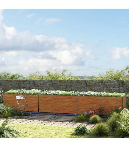 535 x 119 x 77 cm Hochbeet, Holzoptik: Ihrem Selbstversorger-Garten fehlt noch das gewisse Etwas, um Gurken, Kohlrabi und Radieschen optimale Wachstumsbedingungen zu bieten? Und auch Ihr Rücken schmerzt vom konventionellen Gärtnern? Wir haben die ideale Lösung! Mit diesem Kingsize-Hochbeet der Qualitätsmarke GFP in holzoptik und rechteckiger Form müssen Sie sich nicht mehr krumm machen. Das zeitgemäße Hochbeet weist eine Beethöhe von 0,77 und ein Gewicht von 22 mm auf und gilt als äußerst langlebig und wartungsfrei. Die robuste Aluminium-Konstruktion (ca. 22 mm starke Aluminiumplanken) – "Designed in Austria" – garantiert einen stabilen Stand und das zweckmäßige Stecksystem erleichtert den Aufbau. Erhältlich ist das Hochbeet in vier unterschiedlichen Breiten: ca. 77 cm, 99 cm, 119 cm oder 150 cm. Profitieren Sie zudem von 15 Jahren Garantie auf den Aluminium-Rahmen. Ihr eigenes Obst und Gemüse im Garten anzubauen ist Ihr Hobby? Den Selbstversorger-Traum zu leben, erfüllt Sie mit Kreativität, die Sie gerne noch weiter ausleben möchten? Dann ist dieses 1,19x5,35m große Kingsize-Hochbeet der Qualitätsmarke GFP genau das richtige Modell für Sie, denn: Es ist modular erweiterbar. Möchten Sie in Zukunft gerne noch mehr Pflanzen anbauen, lässt sich das Hochbeet flexibel erweitern. Es stehen Ihnen vier Breiten-Varianten zur Erweiterung zur Auswahl: 77 cm, 99 cm, 119 cm und 150 cm. Apropos Größe: Mit einer Grundfläche von ca. 6.3665m² bietet dieses Kingsize-Hochbeet ausreichend Platz für den Anbau von Obst, Gemüse, Kräutern, Blumen, sowie Mischkulturen. Dank der Höhe von ca. [size_height] gewährleistet dieses moderne Modell in der Farbe holzoptik zudem einen rückenschonenden Obst- und Gemüseanbau, ganz ohne Bücken. Gerade, wenn Sie eine längere Zeit am Stück mit der Bepflanzung oder Ernte beschäftigt sind, wird Ihnen diese Höhe zugutekommen. Da das Hochbeet in Schichten angelegt wird, profitieren Sie generell von vielen Möglichkeiten der Bepflanzung. Dank der Verrottung der einzelnen Schichten entsteht im Beet eine innere Wärme, welche das Pflanzenwachstum begünstigt. Der nährstoffreiche Boden führt demzufolge zu einem reichen und gesunden Pflanzenwachstum. Beim Wachstum spielt aber auch das Wetter, sowie die Qualität eine Rolle. Feuchtigkeit und Witterung wird nicht von allen Pflanzen vertragen – aus diesem Grund ist dieses Kingsize-Hochbeet aus Metall gefertigt und nicht aus z.B., Holz. Hochbeete aus Holz sind sehr pflege- und wartungsbedürftig, anfällig auf Schädlinge und witterungsempfindlich. Metall hingegen ist sowohl pflegearm bei hoher Lebensdauer, resistent gegen Schädlingsbefall als auch witterungsbeständig. Speziell besteht die Konstruktion von diesem Hochbeet aus korrosionsbeständigem Aluminium und ist äußerst stabil, wetterfest und ist somit für die ganzjährige Nutzung konzipiert. Es kommen ca. 22 mm starke Planken aus Aluminium zum Einsatz, die bauchigen Verformungen keine Chance bieten. Luftkammern sorgen zudem für eine isolierende Wirkung.... ...