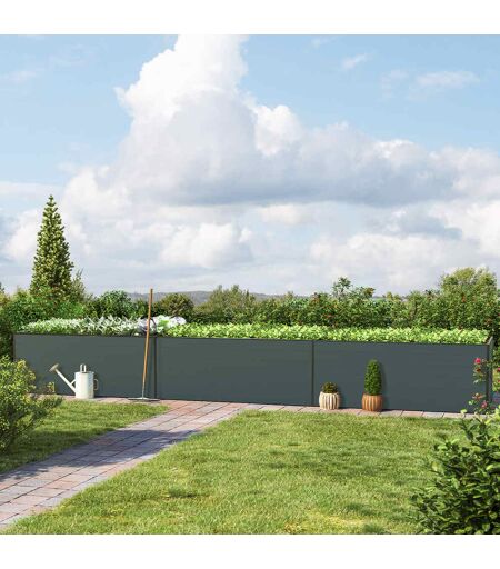 579 x 77 x 77 cm Hochbeet, Anthrazit: Ihrem Selbstversorger-Garten fehlt noch das gewisse Etwas, um Gurken, Kohlrabi und Radieschen optimale Wachstumsbedingungen zu bieten? Und auch Ihr Rücken schmerzt vom konventionellen Gärtnern? Wir haben die ideale Lösung! Mit diesem Kingsize-Hochbeet der Qualitätsmarke GFP in anthrazit und rechteckiger Form müssen Sie sich nicht mehr krumm machen. Das zeitgemäße Hochbeet weist eine Beethöhe von 0,77 und ein Gewicht von 22 mm auf und gilt als äußerst langlebig und wartungsfrei. Die robuste Aluminium-Konstruktion (ca. 22 mm starke Aluminiumplanken) – "Designed in Austria" – garantiert einen stabilen Stand und das zweckmäßige Stecksystem erleichtert den Aufbau. Erhältlich ist das Hochbeet in vier unterschiedlichen Breiten: ca. 77 cm, 99 cm, 119 cm oder 150 cm. Profitieren Sie zudem von 15 Jahren Garantie auf den Aluminium-Rahmen. Ihr eigenes Obst und Gemüse im Garten anzubauen ist Ihr Hobby? Den Selbstversorger-Traum zu leben, erfüllt Sie mit Kreativität, die Sie gerne noch weiter ausleben möchten? Dann ist dieses 0,77x5,79m große Kingsize-Hochbeet der Qualitätsmarke GFP genau das richtige Modell für Sie, denn: Es ist modular erweiterbar. Möchten Sie in Zukunft gerne noch mehr Pflanzen anbauen, lässt sich das Hochbeet flexibel erweitern. Es stehen Ihnen vier Breiten-Varianten zur Erweiterung zur Auswahl: 77 cm, 99 cm, 119 cm und 150 cm. Apropos Größe: Mit einer Grundfläche von ca. 4.4583m² bietet dieses Kingsize-Hochbeet ausreichend Platz für den Anbau von Obst, Gemüse, Kräutern, Blumen, sowie Mischkulturen. Dank der Höhe von ca. [size_height] gewährleistet dieses moderne Modell in der Farbe anthrazit zudem einen rückenschonenden Obst- und Gemüseanbau, ganz ohne Bücken. Gerade, wenn Sie eine längere Zeit am Stück mit der Bepflanzung oder Ernte beschäftigt sind, wird Ihnen diese Höhe zugutekommen. Da das Hochbeet in Schichten angelegt wird, profitieren Sie generell von vielen Möglichkeiten der Bepflanzung. Dank der Verrottung der einzelnen Schichten entsteht im Beet eine innere Wärme, welche das Pflanzenwachstum begünstigt. Der nährstoffreiche Boden führt demzufolge zu einem reichen und gesunden Pflanzenwachstum. Beim Wachstum spielt aber auch das Wetter, sowie die Qualität eine Rolle. Feuchtigkeit und Witterung wird nicht von allen Pflanzen vertragen – aus diesem Grund ist dieses Kingsize-Hochbeet aus Metall gefertigt und nicht aus z.B., Holz. Hochbeete aus Holz sind sehr pflege- und wartungsbedürftig, anfällig auf Schädlinge und witterungsempfindlich. Metall hingegen ist sowohl pflegearm bei hoher Lebensdauer, resistent gegen Schädlingsbefall als auch witterungsbeständig. Speziell besteht die Konstruktion von diesem Hochbeet aus korrosionsbeständigem Aluminium und ist äußerst stabil, wetterfest und ist somit für die ganzjährige Nutzung konzipiert. Es kommen ca. 22 mm starke Planken aus Aluminium zum Einsatz, die bauchigen Verformungen keine Chance bieten. Luftkammern sorgen zudem für eine isolierende Wirkung.... ...