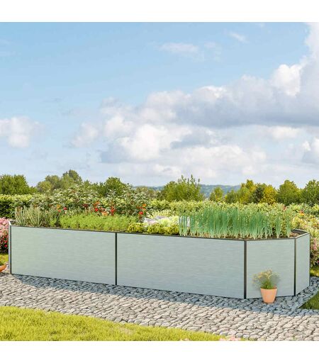 361 x 119 x 77 cm Hochbeet, Aluminium eloxiert: Sie lieben den Gemüseanbau, doch Ihr Rücken zwickt vom vielen Bücken? Dann werden Sie dieses Hobby-Hochbeet der Qualitätsmarke GFP in aluminium mit den Maßen 1,19x3,61m zu schätzen wissen. Die robuste Aluminium-Konstruktion – "Designed in Austria" – garantiert einen stabilen, langlebigen Stand, während das praktische Stecksystem einen einfachen, schnellen Aufbau gewährleistet. Das attraktive Hochbeet weist eine Beethöhe von 0,77 und ein Gewicht von 22 mm auf und hat ca. 22 mm starke Aluminiumplanken. Das Hochbeet gilt als modern und wartungsfrei. Wählen Sie, je nach individuellem Bedürfnis, zwischen unseren vielfältigen Beetformen: U-förmig, eckig, Kreuz-förmig, achteckig, Hantel-förmig, oval oder auch vorn abgeschrägt. Ein weiterer Pluspunkt: Es wird keine zusätzliche Schutzfolie gegen Feuchtigkeit benötigt. Profitieren Sie zudem von 15 Jahren Garantie auf den Aluminium-Rahmen. Dieses 1,19x3,61m große Hobby-Hochbeet der Qualitätsmarke GFP wird zum Hingucker im Garten! Die kreative Form in Verbindung mit der Farbe aluminium lassen das Hochbeet zum modernen Schmuckstück Ihres Gartens werden. Aber nicht nur die Optik des Hochbeets überzeugt, sondern auch die Höhe. Dank der Höhe von ca. [size_height] gewährleistet dieses Hobby-Hochbeet einen rückenschonenden Obst- und Gemüseanbau, ganz ohne Bücken. Gerade, wenn Sie eine längere Zeit am Stück mit der Bepflanzung oder Ernte beschäftigt sind, wird Ihnen diese Höhe zugutekommen. Apropos Bepflanzung: Ihrer Kreativität sind beim Hochbeet keine Grenzen gesetzt! Ob Sie Obst, Gemüse, Kräuter oder doch lieber Blumen oder auf Mischkulturen setzen – mit einer Grundfläche von ca. 4.2959m² bietet dieses Hochbeet viel Raum und Möglichkeiten. Primär bietet das Hochbeet aber die Möglichkeit und das Angebot auf eine gesunde Ernährung. Dadurch dass Hochbeete in verschiedenen Schichten angelegt werden, entsteht eine innere Wärme, die das Pflanzenwachstum natürlich begünstigt. Sie können sich aktiv gegen den Einsatz von künstlichen und für den von natürlichen Düngern einsetzen und so Ihre eigenen, nährstoffreichen und pestizidfreien Obst- und Gemüsepflanzen anbauen. Dieses Hobby-Hochbeet ermöglicht außerdem bei Wind und Wetter den Anbau und die Ernte von Pflanzen – dank der stabilen Konstruktion. Die Konstruktion besteht aus korrosionsbeständigem Aluminium und ist äußerst stabil, wetterfest und somit für die ganzjährige Nutzung konzipiert. Speziell kommen ca. 22 mm starke Planken aus Aluminium zum Einsatz, die bauchigen Verformungen keine Chance bieten. Luftkammern sorgen zudem für eine isolierende Wirkung. Zum Vergleich: Hochbeete aus Holz sind sehr pflege- und wartungsbedürftig, anfällig auf Schädlinge und witterungsempfindlich. Aus diesem Grund ist dieses Hobby-Hochbeet aus hochwertigem Metall gefertigt, welches sowohl pflegearm bei hoher Lebensdauer, resistent gegen Schädlingsbefall als auch witterungsbeständig ist. Für dieses Hochbeet ist keine zusätzliche Folie... ...