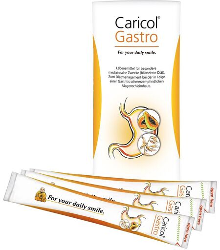 Bitte achten Sie auf eine abwechslungsreiche und ausgewogene Ernährung und gesunde Lebensweise.Diätisches Lebensmittel für besondere medizinische Zwecke (Bilanzierte Diät).Zur dätischen Behandlung von Gastritis.Aus Hafer und dem Fruchtfleisch baumgereifte Papayas.Zutaten:Bio-Papayafrüchte 39,44 g/ 100 g; Bi-hafermehl 6,25 g/ 100 g; Bio-Apfelsaftkonzentrat 10,5 g/ 100 g; natürliches Aroma 0,08 g/ 100 g; Wasser 43,73 g/ 100 g1 Portion enthält Papayafruchtfleisch 7,89 g; Hafermehl 1,25 g; Fruktose 1,12 g; Gluten 4,71 g.Nährwerte: Nährwertangaben je 100 g Brennwert 75 kcal / 315 kJ Fett 0,81 g gesättigte Fettsäuren 0,28 g Kohlenhydrate 14,6 g davon Zucker 10,6 g Eiweiß 1,40 g Salz 22 mg Verzehrempfehlung:2 Sticks/ Tag, je 1 Stick vor den Hauptmahzeiten oder nach Empfehlung des Arztes.Hinweis:Die angegebene empfohlene tägliche Verzehrmenge darf nicht überschritten werden.Dem Produkt wurde keinerlei tierisches eiweiß, Hefe oder Lactose zugefügt und es ist für Diabetiker und Milchallergiker geeignet.Lagerung:Außerhalb der Reichweite von kleinen Kindern lagern.Nettofüllmenge:20 Stück á 20 g = 400 gHersteller:Insitut Allergosan Pharmazeutische Produkte Forschungs- und Vertriebs GmbH8055 Graz ...