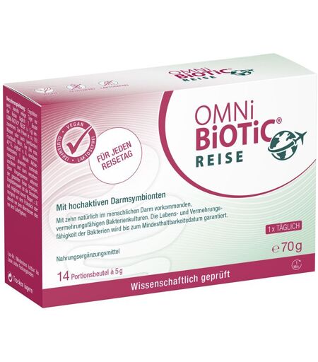 Nahrungsergänzungsmittel sind kein Ersatz für eine ausgewogene und abwechslungsreiche Ernährung und eine gesunde Lebensweise.Wer kennt das nicht?Kurz nach Beginn der Urlaubstage erlebt der Eine oder Andere eine unangenehme Überraschung – der Bauch rebelliert, so mancher verbringt seine Tage auf der Toilette statt am Strand oder bei der Stadtbesichtigung.Ursache dafür können Klimawechsel, ungewohnte Ernährung, der Stress durch lange Autofahrten oder aber Krankheitskeime sein, die mit Speisen oder Getränken aufgenommen werden.Zutaten:Maisstärke, Maltodextrin, Bakterienstämme, FOS, pflanzliche Proteine, Kaliumchlorid, Magnesiumsulfat, Enzyme, MangansulfatVerzehrempfehlung:Am besten beginnen Sie schon einige Tage vor der Reise, täglich morgens vor dem Frühstück 1 Beutel OMNi-BiOTiC® REISE einzunehmen. Das Pulver einfach in Wasser, Milch, Tee oder Joghurt einrühren, 10 Minuten Aktivierungszeit abwarten, nochmals umrühren und dann trinken. Diese Vorgangsweise währen der gesamten Reise fortsetzen.Wenn Sie Ihre Verdauung zusätzlich unterstützen möchten, setzen Sie die tägliche Nahrungsergänzung mit OMNi-BiOTiC® REISE auch noch während der ersten Tage zu Hause weiter fort. Denn die Umstellung vom Urlaub auf den stressigen Arbeitsalltag ist auch für den Darm eine ziemliche Belastung, da kann er ein paar Milliarden Helfer für die Arbeit des Darms ganz gut gebrauchen.Die Milchsäurebakterien in OMNi-BiOTiC® REISE können üble Keime rasch verdrängen und unschädlich machen. Je intakter Ihre Darmschleimhautbarriere durch die Zufuhr von verschiedenen aktiven Darmsymbionten ist, desto geringer die Chance, dass sich gefährliche Keime im Darm ansiedeln und vermehren können.Hinweis:Die angegebene empfohlene Tagesmenge darf nicht überschritten werden.Aufbewahrung: Kühl (6-25 °C) und lichtgeschützt lagern. Außerhalb der Reichweite von kleinen Kindern aufbewahren.Nettofüllmenge:14 Beutel à 5 g = 90gHerstellerdaten: Institut Allergosan Deutschland (privat) GmbHAttilastraße 1612529 Schönefeld ...