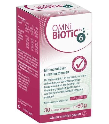 Nahrungsergänzungsmittel sind kein Ersatz für eine ausgewogene und abwechslungsreiche Ernährung und eine gesunde Lebensweise.Gesundheit beginnt im Darm!Diese Erkenntnis ist so alt wie die Medizin selbst. Bereits in den 4000 Jahre alten Schriften ayurvedischer Heilkundiger wird der Darm als das Zentrum des Wohlbefindens beschrieben. Und die moderne Wissenschaft bestätigt diese Einsicht! Nur wenn die Verdauung gut funktioniert, fühlen wir uns rundherum wohl.Denn der Darm steuert mit Milliarden von Mikroorganismen den Großteil aller Stoffwechselvorgänge in unserem Körper, er produziert lebenswichtige Vitamine, Enzyme und Aminosäuren und er neutralisiert alles Schädliche, das mit der Nahrung in unseren Organismus gelangt.Deshalb benötigt unsere Darmwand eine äußerst leistungsstarke Schutzbarriere in Form von gesunden Bakterien, damit alles, was schaden könnte, nicht unsere Darmwand durchdringt und somit ins Blut gelangt.So bleibt Ihr Darm gesund:Achten Sie auf eine regelmäßige Verdauung ohne AbführmittelEssen Sie viel Gemüse, Reis und Kartoffeln, wenig Zucker und FettVerzichten Sie auf Konservierungsmittel in Ihrer NahrungTrinken Sie 2 Liter frisches Wasser täglich!Machen Sie viel Bewegung an frischer LuftLernen Sie Stress und Hektik auszugleichen – beruflich und privatMeiden Sie die unnötige Einnahme von MedikamentenNehmen Sie täglich aktive Darmbakterien zu sich, um den täglichen Verlust, der durch falsche Ernährung und Stress entsteht wieder auszugleichenSo haben Fäulniskeime und Gärgase keine Chance, sich in Ihrem Darm anzusiedeln und die gesunden Darmbakterien zu zerstören.Reinigung und Regeneration:Wesentlich, um Giftstoffe und Fäulniskeime nachhaltig aus dem Verdauungssystem zu beseitigen, ist das Vorhandensein der sechs wichtigsten aktiven Darmbakterienstämme, nämlich verschiedener Lactobazillen, Bifidobakterien und Enterococcen.Diese können täglich über lange Zeit zugeführt werden. Hochwertige Probiotika bestehen aus Milliarden aktiver kleiner Helfer, welche die Darmzotten von faulenden und gärenden Resten befreien, die Vitamin- und Mineralstoffaufnahme verbessern und die empfindlichen Schleimhäute vor schädlichen Stoffen schützen.So unterstützen Sie Ihren Darm ideal bei seiner Arbeit.Das Probiotikum OMNi-BiOTiC® 6 beinhaltet sechs wichtige lebensfähige Bakterienstämme in einer idealen Konzentration von 1 Milliarde Keimen pro Gramm:Bifidobacterium animalis W53 Lactobacillus acidophilus W55 Lactobacillus salivarius W57 Enterococcus faecium W54 Lactococcus lactis W58 Lactobacillus casei W56 Zutaten: Maisstärke, Maltodextrin, Fructooligosaccharide (FOS), Inulin, Polydextrose, Kaliumchlorid, Bakterienstämme*, Reisprotein, Magnesiumsulfat, Enzyme (Amylasen), Mangansulfat.GlutenfreiLactosefreiFrei von Hefe Frei von tierischem Eiweiß Zusammensetzung pro 2 g (= 1 Port.) 4 g 100 g Brennwert 25,84 kJ 6,18 kcal 51,68 kJ 12,36 kcal 1.292 kJ 309 kcal Fett < 0,01 g < 0,01 g 0,10 g davon gesättigte Fettsäuren < 0,01 g < 0,01 g 0,01 g... ...