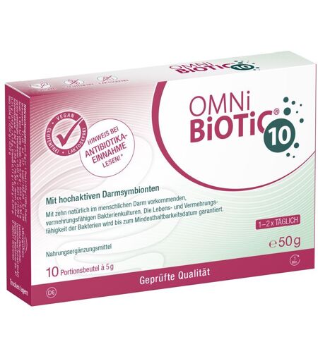 Nahrungsergänzungsmittel sind kein Ersatz für eine ausgewogene, abwechslungsreiche Ernährung und eine gesunde Lebensweise.Für wen ist OMNi-BiOTiC® 10 geeignet? Antibiotika sind bei Erkrankungen, die durch Bakterien ausgelöst werden, eine Wunderwaffe“.Doch leider bringen sie häufig unangenehme Nebenwirkungen mit sich, nämlich Übelkeit und Durchfälle, die oft noch Wochen nach einer Antibiotikaeinnahme andauern.Vor Durchfall spricht man, wenn kolikartige Schmerzen und Bauchkrämpfe oder mehr als drei Stuhlentleerungen am Tag auftreten, der Stuhl sehr weich bis flüssig ist und die Stuhlmenge sich deutlich vermehrt hat.Diese Beschwerden können sofort oder auch erst Wochen nach der ersten Antibiotika-Einnahme auftreten.Der Grund dafür: Durch das Antibiotikum werden nicht nur die Krankheitserreger zerstört, sondern auch ganze Stämme der guten“ Darmbakterien: Das hat zur Folge, dass die Verdauung nicht mehr richtig funktioniert und sich außerdem unerwünschte Keime (z.B. Clostridium difficile) nahezu ungehindert im Darm ansiedeln können.Deshalb ist es gerade bei einer Antibiotika-Therapie wichtig, dem Körper Nachschub“ in Form von natürlich im menschlichen Darm vorkommenden Bakterien zuzuführen, die sich im Darm auch ansiedeln und vermehren können. Wie funktioniert OMNi-BiOTiC® 10? OMNi-BiOTiC® 10 enthält pro Portion 5 Milliarden Darmbakterien aus 10 verschiedenen Stämmen, die natürlich im menschlichen Darm vorkommen.In wissenschaftlichen Studien wurde gezeigt, dass sich die in OMNi-BiOTiC® 10 enthaltenen Bakterien im Darm ansiedeln und vermehren könnenGluten- und laktosefrei. Für Veganer geeignet.Zutaten: Maisstärke, Maltodextrin, Inulin, Kaliumchlorid, Reisprotein, Magnesiumsulfat, Bakterienstämme*, Fructooligosaccharide (FOS), Enzyme (Amylasen), Vanillearoma, Mangansulfat*10 Bakterienstämme mit mindestens 5 Milliarden Keimen pro 1 Portion (= 5 g) und 10 Milliarden Keimen pro 2 Portionen (= 10 g): Lactobacillus acidophilus W55 Lactobacillus acidophilus W37 Lactobacillus paracasei W72 Lactobacillus rhamnosus W71 Enterococcus faecium W54 Lactobacillus salivarius W24 Lactobacillus plantarum W62 Bifidobacterium bifidum W23 Bifidobacterium lactis W18 Bifidobacterium longum W51 Nährwerte: Nährwertangaben pro 5 g (=1 Port.) 10 g 100 g Brennwert 66 kJ / 15,80 kCal 132 kJ / 31,60 kCal 1320 kJ / 316 kCal Fett < 0,01 g 0,01 g 0,09 g dav. ges. Fettsäuren 0,00 g 0,00 g 0,00 g Kohlenhydrate 3,52 g 7,04 g 70,41 g davon Zucker 0,15 g 0,30 g 3,02 g Eiweiß 0,11 g 0,22 g 2,15 g Salz 0,03 g 0,07 g 0,65 g Verzehrsempfehlung:Während der gesamten Antibiotika-Therapie 2 x täglich 1 Beutel OMNi-BiOTiC® 10 (= 5 g) in 1/8 l Wasser einrühren, mindestens 1 Minute Aktivierungszeit abwarten, nochmals umrühren und dann trinken.Nach der Antibiotika-Therapie möglichst noch 14 Tage lang 1 x täglich 1 Beutel einnehmen.Im Idealfall sollte OMNi-BiOTiC® 10 nicht gleichzeitig mit einem Antibiotikum eingenommen werden, sondern mindestens 1 Stunde davor oder danach.Kinder bis zu 3 Jahren... ...