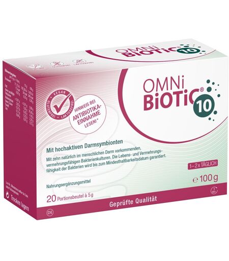 Nahrungsergänzungsmittel sind kein Ersatz für eine ausgewogene, abwechslungsreiche Ernährung und eine gesunde Lebensweise.Für wen ist OMNi-BiOTiC® 10 geeignet?Antibiotika sind bei Erkrankungen, die durch Bakterien ausgelöst werden, eine Wunderwaffe“.Doch leider bringen sie häufig unangenehme Nebenwirkungen mit sich, nämlich Übelkeit und Durchfälle, die oft noch Wochen nach einer Antibiotikaeinnahme andauern.Vor Durchfall spricht man, wenn kolikartige Schmerzen und Bauchkrämpfe oder mehr als drei Stuhlentleerungen am Tag auftreten, der Stuhl sehr weich bis flüssig ist und die Stuhlmenge sich deutlich vermehrt hat.Diese Beschwerden können sofort oder auch erst Wochen nach der ersten Antibiotika-Einnahme auftreten.Der Grund dafür: Durch das Antibiotikum werden nicht nur die Krankheitserreger zerstört, sondern auch ganze Stämme der guten“ Darmbakterien: Das hat zur Folge, dass die Verdauung nicht mehr richtig funktioniert und sich außerdem unerwünschte Keime (z.B. Clostridium difficile) nahezu ungehindert im Darm ansiedeln können.Deshalb ist es gerade bei einer Antibiotika-Therapie wichtig, dem Körper Nachschub“ in Form von natürlich im menschlichen Darm vorkommenden Bakterien zuzuführen, die sich im Darm auch ansiedeln und vermehren können.Wie funktioniert OMNi-BiOTiC® 10?OMNi-BiOTiC® 10 enthält pro Portion 5 Milliarden Darmbakterien aus 10 verschiedenen Stämmen, die natürlich im menschlichen Darm vorkommen.In wissenschaftlichen Studien wurde gezeigt, dass sich die in OMNi-BiOTiC® 10 enthaltenen Bakterien im Darm ansiedeln und vermehren könnenGluten- und laktosefrei.Für Veganer geeignet.Zutaten:Maisstärke, Maltodextrin, Inulin, Kaliumchlorid, Reisprotein, Magnesiumsulfat, Bakterienstämme*, Fructooligosaccharide (FOS), Enzyme (Amylasen), Vanillearoma, Mangansulfat*10 Bakterienstämme mit mindestens 5 Milliarden Keimen pro 1 Portion (= 5 g) und 10 Milliarden Keimen pro 2 Portionen (= 10 g):Lactobacillus acidophilus W55Lactobacillus acidophilus W37Lactobacillus paracasei W72Lactobacillus rhamnosus W71Enterococcus faecium W54Lactobacillus salivarius W24Lactobacillus plantarum W62Bifidobacterium bifidum W23Bifidobacterium lactis W18Bifidobacterium longum W51Nährwerte:Nährwertangabenpro 5 g (=1 Port.)10 g 100 gBrennwert66 kJ / 15,80 kCal132 kJ / 31,60 kCal1320 kJ / 316 kCalFett< 0,01 g0,01 g0,09 gdav. ges. Fettsäuren0,00 g0,00 g0,00 gKohlenhydrate3,52 g7,04 g70,41 gdavon Zucker0,15 g0,30 g3,02 gEiweiß0,11 g0,22 g2,15 gSalz0,03 g0,07 g0,65 gVerzehrsempfehlung:Während der gesamten Antibiotika-Therapie 2 x täglich 1 Beutel OMNi-BiOTiC® 10 (= 5 g) in 1/8 l Wasser einrühren, mindestens 1 Minute Aktivierungszeit abwarten, nochmals umrühren und dann trinken.Nach der Antibiotika-Therapie möglichst noch 14 Tage lang 1 x täglich 1 Beutel einnehmen.Im Idealfall sollte OMNi-BiOTiC® 10 nicht gleichzeitig mit einem Antibiotikum eingenommen werden, sondern mindestens 1 Stunde davor oder danach.Kinder bis zu 3 Jahren nehmen die halbe Dosierungsmenge.Hinweis:Die... ...