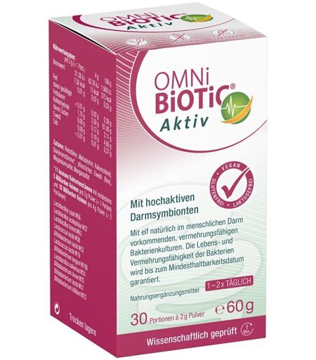 Nahrungsergänzungsmittel sind kein Ersatz für eine ausgewogene und abwechslungsreiche Ernährung und eine gesunde Lebensweise.OMNi-BiOTiC® Aktiv enthält elf speziell ausgewählte, wissenschaftlich erforschte Bakterienstämme. Die enthaltenen Bifidobakterien, Laktobazillen und Laktokokken besiedeln den gesamten Darm in hoher Keimzahl: Pro Portion (= 2 g) sind 5 Milliarden natürliche Darmbakterien in OMNi-BiOTiC® Aktiv enthalten.Zutaten:Reisstärke, Maltodextrin, Pflanzenprotein, Kaliumchlorid, Bakterienstämme, Magnesiumsulfat, Mangansulfat Nährwerte pro Portion (2 g) pro 100 g Brennwert 31,22 kJ / 7,46 kcal 1560 kJ / 373 kcal Fett 0,02 g 0,79 g -davon gesättigte Fettsäuren <0,01 g 0,23 g Kohlenhydrate 1,69 g 84,4 g -davon Zucker <0,01 g 0,05 g Eiweiß 0,14 g 6,96 g Salz <0,01 g 0,33 g Verzehrsempfehlung:1-2 x täglich 1 gestrichenen Messlöffel OMNi-BiOTiC® Aktiv (= 2 g) in 125 ml Wasser einrühren, mindestens 1 Minute Aktivierungszeit abwarten, nochmals umrühren und dann trinken.Empfehlenswert ist die Einnahme morgens vor dem Frühstück und/oder abends kurz vor dem Schlafengehen.Hinweis:Die angegebene empfohlene Tagesmenge darf nicht überschritten werden. Aufbewahrung: Kühl (6-25 °C) und lichtgeschützt lagern. Außerhalb der Reichweite von kleinen Kindern aufbewahren.Nettofüllmenge: 60 gHerstellerdaten: APG Allergosan Pharma GmbH Gmeinstraße 13 AT-8055 Graz ...