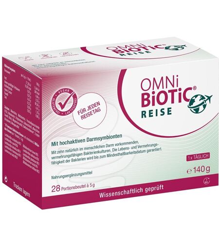 Anwendungsgebiet von OMNi BiOTiC Reise - Sachets für den UrlaubOMNi BiOTiC Reise - Sachets für den Urlaub sorgt mit sieben speziell ausgewählten Bakterienstämmen dafür, dass Sie jeden Tag Ihrer Reise genießen können.Wirkungsweise von OMNi BiOTiC Reise - Sachets für den UrlaubAuf Reisen werden Darm und Verdauung leicht durch die ungewohnte Umgebung aus dem Gleichgewicht gebracht. Ungewohntes Essen und ein veränderter Tagesrhythmus strapazieren die Darmflora und machen sie anfällig für Keime. Durchfallerreger können über unreines Wasser, Eiswürfel, Salat und Obst leicht in den Körper gelangen OMNi BiOTiC Reise - Sachets für den Urlaub enthält sieben ausgewählte Bakterienstämme, die sich im Darm ansiedeln und eine widerstandsfähige Barriere aufbauen. Die Darmschleimhaut wird gestärkt und as Eindringen von Durchfallerregern verhindert. Die Rezeptur enthält zusätzlich unterstützende Enzyme und Ballaststoffe, die ein optimales Überleben der Bakterienstämme ermöglichen.Wirkstoffe / Inhaltsstoffe / ZutatenOMNi BiOTiC Reise - Sachets für den Urlaub enthält: Maisstärke, Maltodextrin, Pflanzenprotein, Fructooligosaccharide (FOS), Polydextrose, Bakterienstämme*, Kaliumchlorid, Magnesiumsulfat, Enzyme (Amylasen), Mangansulfat *7 Bakterienstämme mit mindestens 5 Milliarden Keimen pro 1 Portion (= 5 g): Lactobacillus acidophilus W37 Lactobacillus casei W56 Lactobacillus rhamnosus W71 Lactococcus lactis W58 Lactobacillus salivarius W24 Lactobacillus plantarum W62 Bifidobacterium bifidum W23GegenanzeigenBei bekannter Überempfindlichkeit gegenüber einem der oben genannten Inhaltsstoffe sollte dieses Produkt nicht angewendet werden. DosierungAnwendungsempfehlung von OMNi BiOTiC Reise - Sachets für den Urlaub: Beginnen Sie möglichst einige Tage vor Beginn der Reise mit der Anwendung. Täglich 1 Beutel morgens vor dem Frühstück in Wasser, Milch, Tee oder Joghurt einrühren, mindest ...