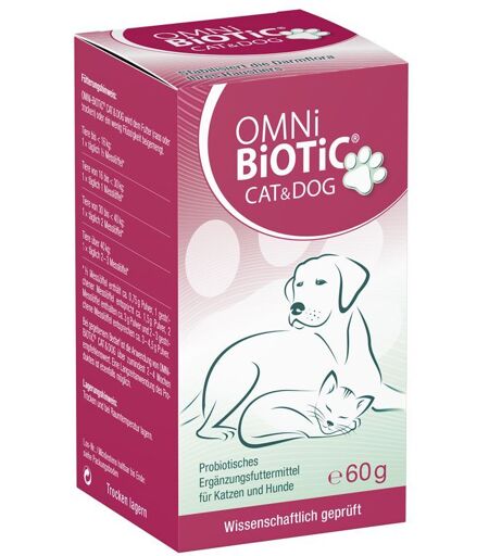 Probiotisches Ergänzungsfuttermittel für Katzen und Hunde Ein tierisch gutes Bauchgefühl Die Gesundheit des vierbeinigen Lieblings ist für jeden Katzen- und Hundebesitzer das Wichtigste – schließlich möchte jeder für seinen „besten Freund“ nur Gutes. Gleich wie beim Menschen ist auch beim Tier der Darm das Zentrum der Gesundheit, und das Wohlbefinden ganz wesentlich von einer optimalen Besiedlung des Darms abhängig. Für wen ist OMNi-BiOTiC® CAT & DOG geeignet? Das Mikrobiom von Katzen und Hunden erfüllt lebenswichtige Aufgaben und ist jenem des Menschen in Zusammensetzung und auch in Funktion sehr ähnlich. So sind die Freunde im tierischen Darm unter anderem dafür verantwortlich, dass Nahrung verwertet werden kann und unverdauliche oder schädliche Stoffe wieder ausgeschieden werden. Wichtige Vitamine, Enzyme, antibiotisch wirksame Stoffe und Hormone werden ebenso von den Darmbakterien produziert, wie wichtige kurzkettige Fettsäuren. Diese sind für die Gesunderhaltung der Darmschleimhaut besonders wichtig, da sie deren Zellen mit Energie versorgen. Die Darmschleimhaut selbst bildet, wie beim Menschen auch, eine wirkungsvolle Barriere gegen Schadstoffe und krankmachende Viren, Parasiten und Keime. Außerdem sind im Darm bis zu 80 % aller Immunzellen des Körpers angesiedelt, die gemeinsam mit der Darmbarriere von zentraler Bedeutung für die tierische Gesundheit sind. Jeder Haustierbesitzer hat schon erlebt, dass der eigene Vierbeiner mit Darmproblemen kämpft, und besonders häufig äußern sich diese in einer gehäuften Entleerung des Darms: So versucht der tierische Körper, fremde oder schädliche Stoffe so rasch als möglich wieder los zu werden. Dabei ist der Kot sehr weich bis flüssig, manchmal finden sich auch Futterreste oder Fremdstoffe darin. Durchfall ist meist ein Symptom eines bestehenden Problems und tritt häufig dann auf, wenn die tierische Darmflora aus dem Gleichgewicht geraten ist. Wie funktioniert OMNi-BiOTiC® CAT & DOG? OMNi-BiOTiC® CAT & DOG ist ein innovatives Probiotikum, das speziell für Katzen und Hunde entwickelt wurde, um die sensible tierische Darmflora zu stabilisieren. Wie bei unseren Produkten für die menschlichen Besitzer steht auch bei OMNi-BiOTiC® CAT & DOG die bewährte OMNi-BiOTiC®-Qualität an erster Stelle: Zwei eigens für Katzen und Hunde geeignete und wissenschaftlich geprüfte Bakterienstämme – Enterococcus faecium NCIMB 10415 und Lactobacillus acidophilus CECT 4529 – die insbesondere zur Stabilisierung der Darmflora bestens geeignet sind, werden in OMNi-BiOTiC® CAT & DOG kombiniert. Das Besondere: Die hohe Anzahl der enthaltenen nützlichen Mikroben garantiert, dass auch in der kleinstmöglichen Tagesdosis mindestens 1,25 Milliarden lebens- und vermehrungsfähige Bakterien enthalten sind. Ergänzt werden die Darmbakterien für Katze und Hund mit dem hochwertigen Ballaststoff MOS (Mannan-Oligosaccharide), der den nützlichen Bakterien im tierischen Darm als Nahrung und somit als Lebensgrundlage dient. Wissenwertes... ...