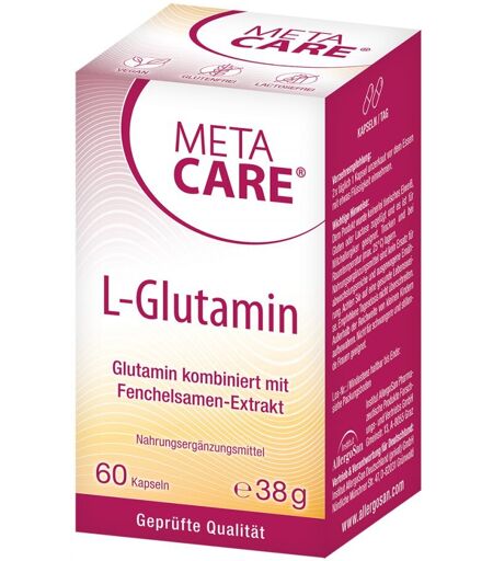 Anwendungsgebiet von Meta Care L-glutamin KapselnL-Glutamin ist eine wichtige Aminosäure, die der Körper für verschiedene Stoffwechselprozesse benötigt und die er vor allem in Zeiten von Stress vermehrt braucht. Sie ist in allen Schleimhäuten vorhanden, insbesondere der Darmschleimhaut, wo sie den Zellen als Energiequelle dient. Meta Care L-glutamin Kapseln ist ein Nahrungsergänzungsmittel und kombiniert wertvolles Glutamin mit Biotin und dem bei Blähungen speziell wohltuenden Extrakt aus Fenchelsamen. So kann Meta Care L-glutamin Kapseln die Bedürfnisse der Darmschleimhaut neben der täglichen Ernährung und der körpereigenen Synthese sinnvoll unterstützen. Wirkstoffe / Inhaltsstoffe / ZutatenInhaltsstoffe von Meta Care L-glutamin Kapseln: Zutaten: L-Glutamin, Fenchelsamenextrakt, Biotin Nährwertangaben: Pro Tagesdosis (= 4 Kapseln) pro 100 g NRV % Brennwert 31,5 kJ 1219,5 kJ 7,6 kcal 292,9kcal Fett < 0,1g 0,1g davon gesättigte Fettsäuren 0,1g 0,1g Kohlenhydrate < 0,1g 3,1g davon Zucker 0,1g 0,1g Eiweiß 1,6g 62,2g Salz 0,1g 0,1g Inhaltstoffe: L-Glutamin 2.000,0 mg - 77,4 g Fenchel- Extrakt* 200,0mg - 7, g7 GegenanzeigenBei bekannter Überempfindlichkeit gegenüber einem der oben genannten Inhaltsstoffe sollte dieses Produkt nicht angewendet werden. Die empfohlene tägliche Verzehrmenge darf nicht überschritten werden. Nahrungsergänzungsmittel sind kein Ersatz für eine gesunde und ausgewogene Ernährung und sollten außerhalb der Reichweite von Kindern aufbewahrt werden.DosierungVerzehrempfehlung von Meta Care L-glutamin Kapseln: 2 x täglich 1 Kapsel unzerkaut vor dem Essen mit etwas Flüssigkeit einnehmen.HinweiseDem Produkt wurde keinerlei tierisches Eiweiß, Gluten oder Lactose zugefügt und es ist für Milchallergiker geeignet. Trocken und bei Raumtemperatur (max. 25° C) lagern. Nahrungsergänzungsmittel sind kein Ersatz für abw ...