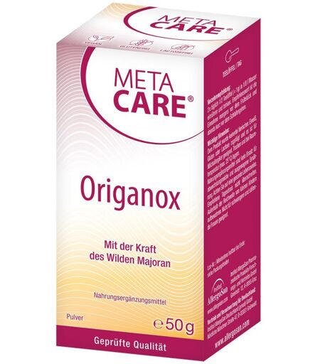 Anwendungsgebiet von Meta Care Origanox PulverMeta Care Origanox Pulver ist ein Nahrungsergänzungsmittel und liefert den hochwertigen, wasserlöslichen Extrakt aus dem Wilden Majoran als einfach einzunehmendes Pulver. Wilder Majoran wird traditionell vor allem bei Atemwegsproblemen eingesetzt. Das aromatische Kraut enthält etwa 800 Substanzen, wie Flavonoide, Gerbstoffe, Bitterstoffe und Vitamin C. Aufgrund seiner Inhaltsstoffe weist der Wilde Majoran antioxidative Eigenschaften auf und kann so dabei helfen, den Organismus vor freien Radikalen zu schützen. Diese aggressiven Sauerstoffverbindungen entstehen im Körper unter anderem vermehrt bei Stress, starker körperlicher Belastung oder durch äußere Einflüsse wie Umweltgifte und Zigarettenrauch.