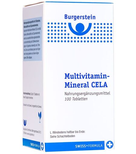 Nahrungsergänzungsmittel sind kein Ersatz für eine ausgewogene und abwechslungsreiche Ernährung und eine gesunde LebensweiseBurgerstein Multivitamin-Mineral CELA Burgerstein Multivitamin-Mineral CELA ist ein umfassendes Basispräparat für die ganze Familie (Kinder ab 12 Jahren) und gehört seit Jahrzehnten zu den beliebtesten Multivitamin-Mineral-Präparaten der Schweiz.Optimal aufeinander abgestimmte Vitamine, Mineralstoffe und Spurenelemente leisten einen wichtigen Beitrag für Ihre Gesundheit und Ihr Wohlbefinden. Burgerstein Multivitamin-Mineral CELA enthält gut verwertbare, organische Verbindungen, die vom Körper optimal aufgenommen werden können sowie natürliches Vitamin E aus Pflanzenölen. Vitamine: A, D3, E, K, C, B1, B6, B12, Niacin, Pantothensäure, Biotin, Folsäure Mineralstoffe: Kalzium und Magnesium Spurenelemente: Eisen, Zink, Selen, Kupfer, Jod, Mangan, Molybdän, ChromZutaten:Calciumsalz der Orthophosphorsäure, Füllstoffe (Cellulose, Natriumcarboxymethylcellulose), L-Ascorbinsäure, Magnesiumoxid, Trennmittel (Mono- und Diglyceride von Speisefettsäuren, Siliciumdioxid, Magnesiumsalz der Speisefettsäuren), Magnesiumbisglycinat, Überzugsmittel (Polydextrose, Hydroxypropylmethylcellulose, , Triglyceride), Gemischte Tocopherole, Eisenfumarat, Zinkbisglycinat, D-alpha-Tocopherylsäuresuccinat, Calciumbisglycinat, Mangangluconat, Nicotinamid, Retinylacetat, Kupfergluconat, Calcium-D-pantothenat, Pyridoxin-5’-phosphat, Riboflavin, Thiaminmononitrat, Pteroylglutaminsäure, Chrompicolinat, Kaliumiodid, D-Biotin, Natriumselenat, Natriummolybdat, Phyllochinon, Cholecalciferol, Cyanocobalamin.Nährwerte: Durchschnittliche Nährwerte: pro Tagesportion: NRV* Vitamin A 0,80 mg 100% Vitamin B1 (Thiamin) 1,10 mg 100% Vitamin B2 (Riboflavin) 1,40 mg 100% Vitamin B6 (Pyridoxin) 1,40 mg 100% Vitamin B12 (Cobalamin) 2,50 µg 100% Biotin (B7/H) 150,00 µg 300% Folsäure (B9) 600,00 µg 300% Vitamin B3 (Niacin) 16,00 mg 100% Vitamin B5 (Pantothensäure) 6,00 mg 100% Vitamin C 240,00 mg 300% Vitamin D3 5,00 µg 100% Vitamin E 12,00 mg 100% Vitamin K 75,00 µg 100% Chrom 40,00 µg 100% Eisen 14,00 mg 100% Jod 150,00 µg 100% Kalzium 240,00 mg 30% Kupfer 120,00 mg 32% Mangan 2,00 mg 100% Molybdän 50,00 µg 100% Selen 55,00 µg 100% Zink 10,00 mg 100% *NRV = Referenzmenge für die tägliche Zufuhr nach EU-Lebensmittel- informationsverordnung (LMIV)Verzehrempfehlung:Täglich 2 Tabletten mit etwas Flüssigkeit einnehmen.Hinweis:Die angegebene empfohlene Tagesmenge darf nicht überschritten werden.Aufbewahrung: Kühl (6-25 °C) und lichtgeschützt lagern. Außerhalb der Reichweite von kleinen Kindern aufbewahren.Nettofüllmenge: 100 TablettenHerstellerdaten: Burgerstein GmbH Währinger Strasse 20/12 1090 Wien Österreich ...