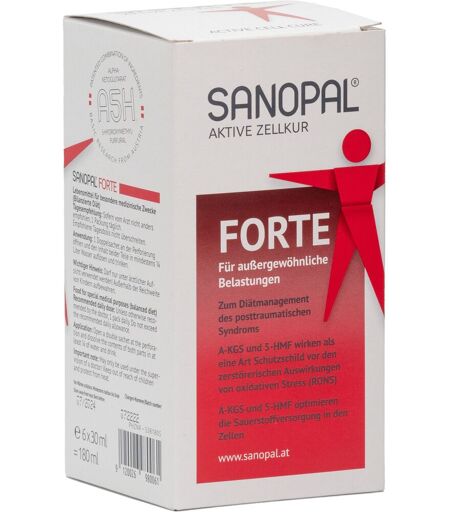 Lebensmittel für besondere medizinische Zwecke (Bilanzierte Diät) SANOPAL FORTE Trinklösung bei Erschöpfung, Long-COVID, Burnout sowie vor/nach Operationen und Chemotherapien Was ist SANOPAL FORTE? SANOPAL FORTE besteht aus der einzigartigen Wirkstoffkombination A5H. Dabei handelt es sich um Alpha- Ketoglutarat (AKG) und 5-Hydroxymethylfurfural (5-HMF). AKG ist der zentrale Regulator und Aktivator in den Mitochondrien, den Energiekraftwerken unserer Zelle. Als Antioxidans sorgt es dafür, dass die Mitochondrien effizienter Energie produzieren. Dabei kann es krankmachenden oxidativen/nitrosativen Stress in Energie verwandeln. Wenn wir altern oder krank sind, fehlt den Zellen AKG zur Energiegewinnung. Dadurch kann es zu Erschöpfungszuständen kommen. 5-HMF hilft den roten Blutkörperchen dabei, mehr Sauerstoff aufzunehmen und zu transportieren. Somit wird die Sauerstoffsättigung im Blut und auch die Sauerstoffversorgung der Zellen erhöht. Weiters ist 5-HMF mit unzähligen positiven Effekten ein wahres Superfood für die Mitochondrien. Es hilft bei der Entgiftung von toxischen Stickstoffverbindungen und aktiviert wichtige Gene zum Zellschutz. Wie wirkt SANOPAL FORTE? Oxidativer/Nitrosativer Stress schädigt Proteine, Lipide, Kohlenhydrate und beeinträchtigt die Aufnahmefähigkeit und Energiegewinnung der Zellen. In diesem belasteten Zustand stellt Ihre Zelle nur 2 ATP (Energieeinheiten) statt 36 ATP her. Dies entspricht weniger als 6% von dem, was die Zelle leisten sollte. SANOPAL FORTE wandelt oxidativen/nitrosativen Stress in Energie um und versorgt die Zelle mit Sauerstoff. Somit kann Ihre Zelle wieder 36 ATP herstellen und ist wieder 100% Leistungsfähig. Dadurch wird Ihr Körper optimal mit Energie versorgt - und das ohne bekannte Nebenwirkungen. Dies führt zu erhöhter Leistungsfähigkeit, schnellerer Erholung nach Überbelastungen und Regenerationsphasen nach Krankenhausaufenthalten können signifikant verkürzt werden. Wo wird SANOPAL FORTE angewendet? BEI LONG-COVID UND COVID-19 Kann bei viralem Infekt die Verbreitung des Virus im Körper reduzieren. Zur schnelleren Rehabilitation und Besserung des Allgemeinzustandes. Trägt zu einer normalen Funktion des Energiestoffwechsels bei. Verwandelt zellulären Stress in Energie und erhöht die Sauerstoffversorgung im Blut. BEI UND NACH OPERATIONEN Kann signifikant die Krankenhausaufenthaltsdauer verkürzen. Weniger Komplikationen nach Operationen. Verbesserter Operationsverlauf. Erhöhte Leistungsfähigkeit vor Operationen und dadurch bessere Rehabilitation. BEI BURNOUT UND FATIGUE Gleicht Mängel in der Energiegewinnung aus, die durch Stress entstehen. Erhöht das körpereigene antioxidative Potential, indem Stress in Energie umgewandelt wird. Entzündungshemmende Wirkung. Für spürbar mehr Energie. Zutaten: Wasser, Zucker, Alpha-Ketoglutarsäure, 5-Hydroxymethylfurfural und Magnesiumchlorid. Säureregulator: Natriumhydroxid, Kaliumhydroxid. SANOPAL FORTE enthält A5H – eine patentierte Wirkstoff-Kombination von AKG... ...