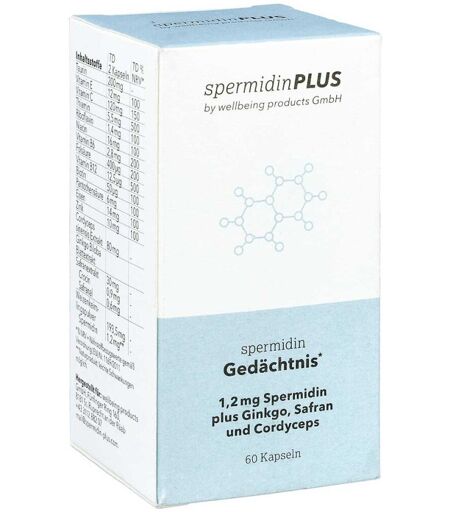 Anwendungsgebiet von Spermidinplus Gedächtnis KapselnSpermidinplus Gedächtnis Kapseln - Mikronährstoffkomplex, 1,2 mg Spermidin, mit Ginkgo, Safran, Cordyceps und aktivierten B-Vitaminen (Monatsvorrat 60 Kapseln) – Nahrungsergänzungsmittel. Vitalität beginnt im Kopf. Nur wer geistig fit ist, lebt leichter und vor allem bewusster. Ein fortschreitendes Lebensalter, aber auch jahrelange Schwerarbeit, Mehrfachbelastungen und/oder Reizüberflutungen können uns müde im Kopf machen. Die „Gehirnnahrung“ von spermidinPLUS ist ideal dosiert, ausgezeichnet verträglich und entspricht dem aktuellen, orthomolekularen Wissensstand. Die Spezialformel ist für die längerfristige Einnahme konzipiert. Ihr Plus für mehr geistige Kraft. Für Lebensfreude und das innere Gleichgewicht Mit 1,2 mg Spermidin aus Weizenkeimlingspulver pro Tagesdosis Liefert essenzielle B-Vitamine, Eisen, Vitamin E, Vitamin C und Zink Zink und Eisen tragen zu einer normalen, kognitiven Funktion bei Vitamin B2, B3, B6 und B12 tragen zu einer normalen Funktion des Nervensystems bei Ihr Plus für das Gedächtnis Wirkstoffe / Inhaltsstoffe / ZutatenSpermidinplus Gedächtnis Kapseln enthält: Zutaten: Weizenkeimlingspulver, Taurin, Hydroxypropylmethylcellulose (Kapselhülle), L-Ascorbinsäure, Cordyceps sinensis Extrakt, Ginkgo Biloba Blattextrakt, Eisenbisglycinat, Zinkcitrat, Safranextrakt, D-alpha-Tocopherylacetat, Nicotinamid, Calcium-D-pantothenat, Thiaminhydrochlorid, Pyridoxal-5‘-phosphat, Natrium-Riboflavin-5‘-phosphat, (6S)-5-Methyltetrahydrofolsäure, Glucosaminsalz, D-Biotin, 5‘-Desoxyadenosylcobalamin. Das Produkt ist gemäß Verordnung (EU) Nr. 1169/2011 in Bezug auf Allergene kennzeichnungspflichtig: Das Produkt enthält glutenhaltiges Getreide. Inhaltsstoffe 2 Kapseln % NRV* Weizenkeimlingspulver 386 mg - Spermidin 1,2 mg** - Safranextrakt 30 mg - Crocin 0,9 mg - Safranal 0,6 mg - ...