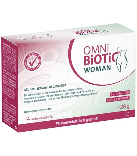 Nahrungsergänzungsmittel stellen keinen Ersatz für eine abwechslungsreiche Ernährung dar.OMNi-BiOTiC® WOMAN - Was Frau wirklich braucht: Ein Nahrungsergänzungsmittel speziell für Frauen entwickelt, zur Unterstützung einer gesunden Vaginalflora mit natürlichen Bakterienkulturen. Einfach in der Anwendung und für den täglichen Gebrauch geeignet, auch während der Periode. Unterstützt die Vaginalflora mit vier vermehrungsfähigen Bakterienstämmen Frei von Hormonen, tierischem Eiweiß, Gluten, Hefe und Lactose Einfach trinken – keine zusätzliche Anwendung erforderlich Geeignet für Diabetiker, Milchallergiker, während der Schwangerschaft und StillzeitOMNi-BiOTiC® WOMAN - Alle Vorteile auf einen Blick: Enthält 4 humane Bakterienstämme: Lactobacillus crispatus, Lactobacillus rhamnosus, Lactobacillus gasseri und Lactobacillus jensenii Mindestens 5 Milliarden Keime pro 1 Portion (2 g) und 10 Milliarden Keime pro 2 Portionen (4 g) Monatspackung mit 28 Beuteln – insgesamt 140 Milliarden Bakterien Für eine gesunde und ausgeglichene Vaginalflora Frei von Hormonen und für Diabetiker geeignetInhaltsstoffe:Maltodextrin, Fructooligosaccharide (FOS), Bakterienstämme**4 humane Bakterienstämme: Lactobacillus crispatus LBV88, Lactobacillus rhamnosus LBV96, Lactobacillus gasseri LBV150N, Lactobacillus jensenii LBV116Frei von Hormonen, tierischem Eiweiß, Gluten, Hefe und Lactose. Zusammensetzung 1 Portion (= 2 g) 2 Portionen (= 4 g) Humane Bakterienstämme 5 Milliarden Keime 10 Milliarden Keime Verzehrempfehlung:1-2 x täglich 1 Beutel OMNi-BiOTiC® WOMAN in 1/8 l Wasser einrühren, mindestens 1 Minute Aktivierungszeit abwarten, nochmals umrühren und dann trinken. Empfehlenswert ist die Einnahme auf möglichst leeren Magen, z.B. vor dem Frühstück und vor dem Abendessen.Hinweis:Die angegebene empfohlene Tagesmenge darf nicht überschritten werden.Aufbewahrung:Kühl, trocken und lichtgeschützt lagern. Bitte beachten Sie ggf. weitere Lagerhinweise auf der Verpackung.Nettofüllmenge:14 Beutel à 2 gHerstellerdaten:Allergosan Institut für mikrobiologische Forschung GmbHGmeinstraße 138055 Graz, Österreich ...