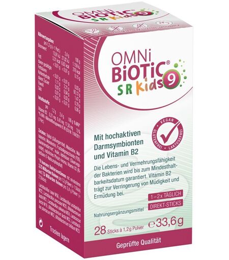 Nahrungsergänzungsmittel sind kein Ersatz für eine ausgewogene und abwechslungsreiche Ernährung und eine gesunde Lebensweise.OMNi-BiOTiC SR-9 Kids – 28 Beutel mit wertvollen BakterienstämmenDas OMNi-BiOTiC SR-9 Kids ist ein speziell entwickeltes Probiotikum für Kinder, das 9 wissenschaftlich geprüfte Bakterienstämme mit Vitamin B2 kombiniert. Ideal für den täglichen Einsatz – die innovativen Direkt-Sticks können ohne Wasser eingenommen werden und lösen sich direkt im Mund auf. Perfekt für Schule und Alltag!Zutaten:9 Bakterienstämme (Lactobacillus & Bifidobacterium-Spezies)Vitamin B2 (Riboflavin)Weitere Inhaltsstoffe: Maltodextrin, Aroma, SüßungsmittelNährwertangaben: Nährwerte Energie kJ/kcal - Vitamin B2 mg - Bakterienstämme CFU - Verzehrsempfehlung:Kinder ab 3 Jahren: Täglich 1–2 Direkt-Sticks einnehmen.Sticks einfach entlang der Perforation aufreißen und den Inhalt direkt im Mund zergehen lassen.Aufbewahrungs- & Verwendungshinweis:Nicht für Kinder unter 3 Jahren geeignetDie empfohlene Tagesmenge nicht überschreitenKühl, trocken & lichtgeschützt lagernNettofüllmenge:28 x 1,2 g BeutelHestellerdaten:INSTITUT ALLERGOSAN Deutschland (privat) GmbHMozartstraße 153115 Bonn, Deutschland ...