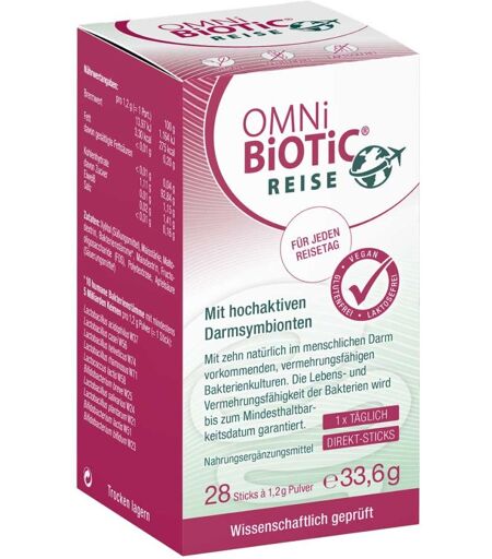 Anwendungsgebiet von Omni Biotic Reise Pulver StickBei Auslandsaufenthalten kann das Verdauungssystem durch äußere Einwirkungen unterschiedlichster Art (ungewohntes Essen, veränderter Tagesrhythmus) aus dem Gleichgewicht geraten. Unangenehmer wird es, wenn durch den Genuss von Wasser, Eiswürfeln oder auch nur Salaten und ungeschältem Obst fremde Keime in unser Verdauungssystem gelangen – und der Darm versucht, diese Eindringlinge wieder loszuwerden.Während die häufigsten Durchfallerreger, nämlich alle ETEC-Stämme, nur unangenehm sind, aber selbstlimitierend (d.h. dass die Keime sich selbst mit dem Durchfall ausscheiden), ist das Eindringen unerwünschter Erreger wie zum Beispiel Salmonellen, Shigellen und Campylobacter sehr viel problematischer.Daher sollte man neben allen anderen Urlaubsvorkehrungen nicht vergessen, auch den Darm auf die Reise vorzubereiten – Experten empfehlen dafür spezielle Multispezies-Synbiotika.Wie funktionieren Omni Biotic Reise Pulver Stick?In OMNi-BiOTiC® REISE sorgen zehn speziell ausgewählte Bakterienstämme und die hohe Anzahl von 5 Milliarden hochaktiven „Helfern“ (Darmbakterien) pro Portion dafür, dass Sie jeden Tag Ihrer Reise genießen können.OMNi-BiOTiC® REISE Direkt-Sticks enthalten dieselben wissenschaftlich geprüften Bakterienstämme wie das bewährte OMNi-BiOTiC® REISE in Pulverform:• 5 Milliarden hochaktive „Helfer“ (Darmbakterien) sorgen dafür, dass Sie jeden Tag Ihrer Reise genießen können.• In praktische Direkt-Sticks verpackt, wurden OMNi-BiOTiC® REISE Direkt-Sticks speziell zur Einnahme ohne Wasser entwickelt.• OMNi-BiOTiC® REISE Direkt-Sticks zergehen direkt auf der Zunge und sind neutral im Geschmack.Wirkstoffe / Inhaltsstoffe / ZutatenZutaten von Omni Biotic Reise Pulver Stick:Xylitol (Süßungsmittel), Maisstärke, Maltodextrin, Bakterienstämme, Maisdextrin, Fructooligosaccharide (FOS), Polydextrose, Apfelsäure (Säuerungsmittel)Ein Stick (= 1,2 g) ...