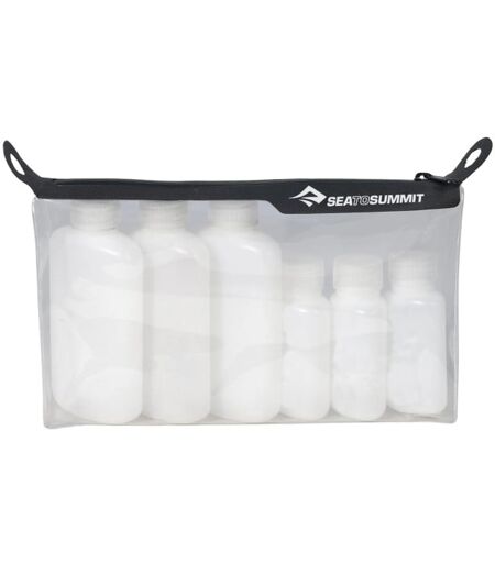 Die Sea to Summit Clear Ziptop Pouch ist perfekt für Flugreisen, aber auch für den Campingurlaub oder die Trekkingreise geeignet. Das Set bringt eine Tasche aus flexiblem, leichten und transparentem TPU mit, die über den Reißverschluss auf der Oberseite geöffnet wird. Darin befinden sich, von außen gut sichtbar, sechs kleine Flaschen mit Schraubverschluss in zwei verschiedenen Größen – 100 ml und 50 ml. Dadurch erfüllt die Sea to Summit Clear Ziptop Pouch die Vorgaben für die Mitnahme z. B. von Hygieneartikeln bei Flugreisen, die in kleinen Mengen abgefüllt und in einer transparenten Hülle gelagert werden müssen. Die Flaschen im Sea to Summit Clear Ziptop Pouch bestehen aus stabilem HDPE und lassen nach außen durchschimmern, was sich im Inneren befindet. So kannst du nicht nur Shampoo, Seife und andere Pflegeprodukte, sondern auch flüssige Lebensmittel in Reisegröße abfüllen und sie auslaufsicher transportieren. Der Reißverschluss auf der Oberseite ist laminiert, damit von außen nicht so schnell Feuchtigkeit nach innen gelangen kann. An beiden Enden des oben liegenden Reißverschlusses sind Schlaufen eingearbeitet, damit du die Sea to Summit Clear Ziptop Pouch zum Beispiel am Rucksack befestigen oder unterwegs im Bad oder draußen aufhängen kannst. Gleichzeitig kannst du an diesen Schlaufen gegenhalten, um das Öffnen und Schließen des Reißverschlusses einfacher zu gestalten. Alles in allem ist die Sea to Summit Clear Ziptop Pouch ein leichter und praktischer Begleiter für all deine Outdoor Touren und Reisen und bringt dir individuelle Mengen an Hygieneartikeln in TSA-tauglicher Verpackung mit. Einzelgewichte Flaschen: 100 ml je 17 g, 50 ml je 11 g ...