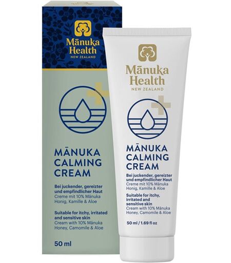 Anwendungsgebiet von Manuka Health Calming CreamDie Manuka Health Calming Cream kombiniert 10 % erstklassigen Mānuka-Honig aus Neuseeland mit pflegender Kamille und beruhigender Aloe Vera. Diese natürliche Rezeptur wurde speziell für empfindliche, gereizte und juckende Haut entwickelt.Die angenehm leichte Textur lässt sich mühelos auftragen, zieht schnell ein und entfaltet ihre beruhigenden Eigenschaften unmittelbar nach dem Auftragen. Sie unterstützt die Regeneration und spendet intensive Feuchtigkeit – ideal bei trockener, schuppiger oder sonnengestresster Haut.Geeignet für jedes Alter und jeden Hauttyp – für ein rundum gepflegtes, geschmeidiges Hautgefühl.10 % hochwertiger Mānuka-HonigBeruhigende Rezeptur zur Regeneration und intensive Pflege empfindlicher, gereizter HautAngereichert mit Kamille und Aloe Vera99,7 % natürliche InhaltsstoffeZertifizierte Naturkosmetik nach Natrue Dermatologisch getestetVerträglichkeit für alle Hauttypen bestätigtOhne Zusatz von Duft- und Farbstoffen, Parabenen, Mineralölen oder SilikonenWirkstoffe / Inhaltsstoffe / ZutatenManuka Health Calming Cream enthält:Aqua, Mell, Cetearyl Alcohol, Cetearyl Glucoside, Glycerin, Carthamus Tinctorius Seed Oil, Helianthus Annuss Seed Oil, Calendula Officinalis Flower Extract, Tocopherol, Linum Usitatissimum Seed Oil, Xylitylglucoside, Anthydroxylitol, Xylitol, Calophyllum Inophyllum Seed Oil, Triethyl Citrate, Glyceryl Caprylate, Benzoic Acid, Sclerotium Gum, Xanthan Gum, Chamomilla Recutita Flower Extract, Potassium Sorbate, Bisabolol, Aloe Barbendensis Leaf Juice PowderGegenanzeigenBei bekannter Überempfindlichkeit gegenüber einem der oben genannten Inhaltsstoffe sollte dieses Produkt nicht angewendet werden.DosierungAnwendungsempfehlung von Manuka Health Calming Cream:Tragen Sie eine kleine Menge der Creme auf die zuvor gereinigte, trockene Haut auf und verteilen Sie sie sanft. Bei Bedarf kann die Anwendung jederzeit wiederholt werden.Die Pflegeformel ist für alle Al ...