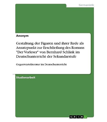 Anonymous - Gestaltung der Figuren und ihrer Rede als Ansatzpunkt zur Erschließung des Romans Der Vorleser von Bernhard Schlink im Deutschunterricht der Sekundarstufe: Gegenwartsliteratur im Deutschunterricht