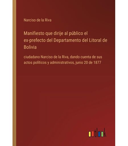 Binding : paperback, Label : Manifiesto que dirije al público el ex-prefecto del Departamento del Litoral de Bolivia : ciudadano Narciso de la Riva, dando cuenta de sus actos políticos y administrativos, junio 20 de 1877, medium : paperback, numberOfPages : 64, publicationDate : 2024-06-05, languages : spanish, ISBN : 3368055275 ...