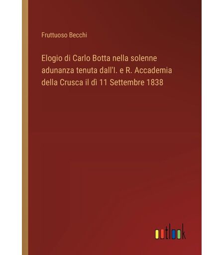 Brand : Outlook Verlag, Binding : paperback, Label : Elogio di Carlo Botta nella solenne adunanza tenuta dall'I. e R. Accademia della Crusca il dì 11 Settembre 1838, medium : paperback, numberOfPages : 40, publicationDate : 2024-07-17, languages : italian, ISBN : 3385071534 ...
