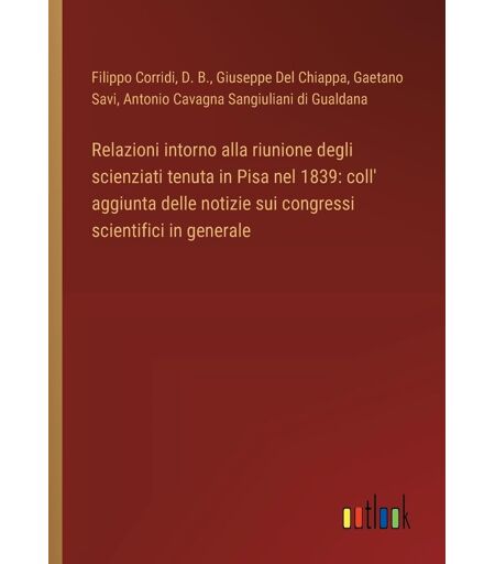 Brand : Outlook Verlag, Binding : paperback, Label : Relazioni intorno alla riunione degli scienziati tenuta in Pisa nel 1839 : coll' aggiunta delle notizie sui congressi scientifici in generale, medium : paperback, numberOfPages : 64, publicationDate : 2024-07-16, languages : italian, ISBN : 338507309X ...