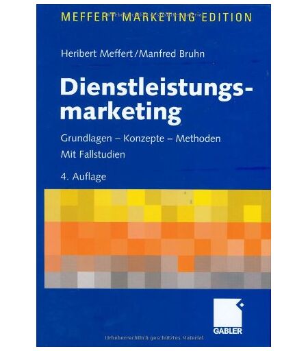 Binding : Gebundene Ausgabe, Edition : 4, vollst. überarb. u. erw. Aufl. 2003, Label : Gabler Verlag, Publisher : Gabler Verlag, medium : Gebundene Ausgabe, numberOfPages : 846, publicationDate : 2003-02-14, authors : Heribert Meffert, Manfred Bruhn, languages : german, ISBN : 340943688X ...