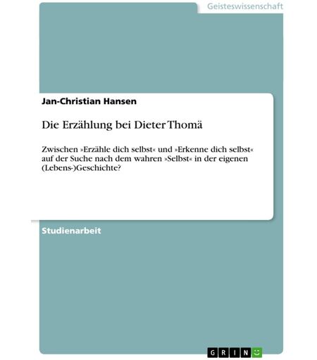Brand : Grin Verlag, Binding : paperback, Edition : 1., Label : Die Erzählung bei Dieter Thomä : Zwischen 'Erzähle dich selbst' und 'Erkenne dich selbst' auf der Suche nach dem wahren 'Selbst' in der eigenen (Lebens-)Geschichte?, medium : paperback, numberOfPages : 24, publicationDate : 2013-10-12, languages : german, ISBN : 3656510229 ...