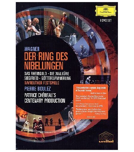 AspectRatio : 1.33 : 1, AudienceRating : Freigegeben ab 6 Jahren, Brand : BOULEZ, PIERRE/CHÉREAU, PATRICE/OBF, Binding : DVD, Label : Universal/Music/DVD, Publisher : Universal/Music/DVD, NumberOfDiscs : 5, NumberOfItems : 8, PackageQuantity : 1, Format : NTSC, medium : DVD, publicationDate : 2011-10-24, releaseDate : 2005-06-20, runningTime : 832 minutes, theatricalReleaseDate : 1980-01-01, actors : Gwyneth Jones, Jeannine Altmeyer, Hannah Schwarz, directors : Patrice Chereau ...