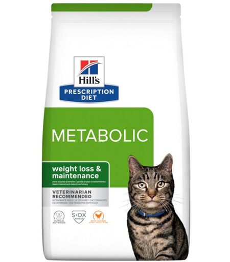 Hill's Prescription Diet Metabolic Katzenfutter mit Huhn Bitte beachten Sie, dass spezielles Diätfutter nur nach tierärztlicher Empfehlung eingesetzt und die Fütterung – einschließlich möglicher Verlängerungen – regelmäßig mit Ihrer Tierärztin oder Ihrem Tierarzt abgestimmt werden sollte. Lassen Sie Ihr Tier dabei etwa alle sechs Monate kontrollieren und suchen Sie bei jeder Verschlechterung seines Gesundheitszustands umgehend fachlichen Rat. Klinisch erprobtes Diätfutter zur Unterstützung der Gewichtsabnahme und Gewichtserhaltung bei Katzen mit individuellem Energieverbrauch Hill's PRESCRIPTION DIET Metabolic Trockenfutter für Katzen mit Huhn ist eine klinisch getestete Diätnahrung zur Unterstützung beim Gewichtsmanagement. Entwickelt von Tierärzt:innen und Ernährungsexpert:innen, aktiviert dieses Futter auf natürliche Weise den individuellen Energieverbrauch Ihrer Katze, fördert eine gesunde Fettverbrennung und trägt so effektiv zur Gewichtsabnahme bei. Eine einzigartige Fasermischung sorgt dafür, dass sich Ihre Katze langanhaltend satt fühlt. 88 % der Katzen reduzierten mit dieser Ernährung ihr Gewicht innerhalb von zwei Monaten. Auch nach Erreichen des Idealgewichts wird die weitere Fütterung empfohlen, um Rückfälle zu vermeiden und die Lebensqualität zu fördern. Inhaltsstoffe/Zusammensetzung: Fleisch und tierische Nebenerzeugnisse (16 % Huhn), pflanzliche Eiweißextrakte, Getreide, pflanzliche Nebenerzeugnisse, Gemüse, Öle und Fette, Saaten, Mineralstoffe. Dosierung: Für Gewichtsverlust – Tägliche Fütterungsmenge: Idealgewicht (kg)Trockenfutter (g) 225 335 445 555 665 7+10 g pro kg Zur Gewichtserhaltung – Tägliche Fütterungsmenge: Idealgewicht (kg)Trockenfutter (g) 240 355 470 580 695 7+15 g pro kg Empfehlung für gemischte Fütterung – Gewichtsverlust: Idealgewicht (kg)Frischebeutel 85 gTrockenfutter (g) 21+10 31+20 41+30 51+35 61+45 7+1+8 g pro kg Empfehlung für gemischte Fütterung – Gewichtserhaltung: Idealgewicht (kg)Frischebeutel 85 gTrockenfutter (g) 21+25 31+40 41+50 51+65 62+75 7+1+13 g pro kg Zusatzstoff je KG: Ernährungsphysiologische Zusatzstoffe: 3b103 (Eisen) 65,9 mg, 3b202 (Jod) 1,6 mg, 3b405 (Kupfer) 6,5 mg, 3b502 (Mangan) 126 mg, 3b603 (Zink) 136 mg, 3b801 (Selen) 0,2 mg. Enthält natürliches Antioxidans. Umsetzbare Energie: 3.451 kcal/kg. Analytische Bestandteile: Protein 38,2 %, Fettgehalt 12,8 %, Rohfaser 9,3 %, Rohasche 5,9 %, Calcium 0,93 %, Phosphor 0,72 %, Natrium 0,32 %, Kalium 0,71 %, Magnesium 0,09 %; pro kg: Vitamin A 9.745 IE, Vitamin D3 745 IE, Vitamin E 810 mg, Vitamin C 122 mg, Beta-Carotin 1,5 mg. Aufbewahrung/Hinweise: • Dieses Diätfutter darf nur auf tierärztliche Empfehlung hin verfüttert werden. • Vor der Anwendung oder Verlängerung der Fütterungsdauer ist Rücksprache mit dem Tierarzt nötig. • Regelmäßige tierärztliche Kontrolle (mind. alle 6 Monate) wird empfohlen. • Bei gesundheitlicher Verschlechterung Ihres Tieres ist umgehend ein Tierarzt zu konsultieren. • Trocken, kühl und lichtgeschützt lagern.... ...