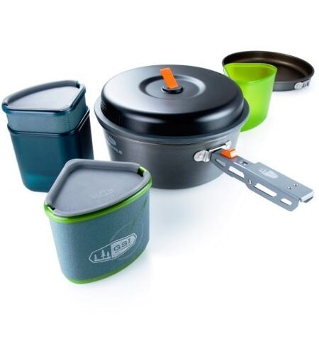 Das Pinnacle Backpacker Set überzeugt schon auf den ersten Blick mit seinem klugen Design, das es ermöglicht, die vielen verschiedenen Bestandteile kompakt im Kochtopf zu verstauen. Auf den zweiten Blick zeigen sich anschließend die hochwertigen und langlebigen Materialien des Koch- und Essgeschirrs, das sich dank unterschiedlicher Farben sogar stets schnell zuordnen lässt. Von außen nach innen gesehen hält zunächst ein robuster Packsack das Set zusammen, der sich bei genauerem Hinsehen auch als Spülschüssel entpuppt. Darin befindet sich der 2 Liter große Kochtopf aus hart-eloxiertem Aluminium mit Anti-Haft-Beschichtung, der im gepackten Zustand von einem Deckel mit Siebausguss und der Pfanne abgedeckt wird. Ein abnehmbarer Griff für Topf und Pfanne befindet sich ebenfalls im Set. Außerdem findest du in dem Topf jeweils zwei Schüsseln und Becher in dreieckiger Form, die auch ineinander gestapelt werden. Die Schüsseln sind für warme Mahlzeiten oder Getränke mit einer abnehmbaren Neoprenhülle und einem Deckel mit Trinköffnung ausgestattet. Das Pinnacle Backpacker Kochset lässt auch noch genug Spielraum, dass du dein Besteck oder den kleinen Gaskocher darin verstauen kannst. Platzsparender geht es wirklich nicht! ...