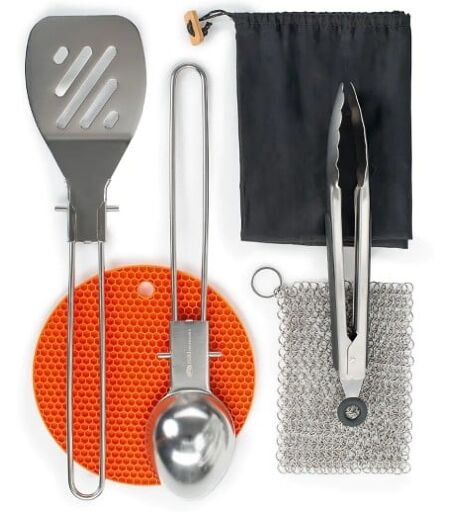 Das GSI Folding Chef's Tool Set wertet deine Outdoorküche auf und hilft dir dabei, auch unterwegs, auf dem Zeltplatz oder auf der Terrasse Zuhause leckere Outdoorgerichte zuzubereiten. Das Kochbesteck besteht aus pflegeleichtem Edelstahl und ist im Unterschied zu manch anderem Outdoor Kochbesteck nicht zu minimalistisch in den Abmessungen. So kannst du für größere Gruppen mit dem Pfannenwender, dem Schöpflöffel und der Grillzange bequem auch umfangreiche Mahlzeiten zubereiten. Der Schöpflöffel kann dabei auf zwei verschiedenen Positionen fixiert werden, je nachdem, ob du ihn zum Umrühren oder zum Umfüllen nutzen willst. Die Grillzange kannst du so festklemmen, dass sie im Packbeutel nicht von allein aufgeht. Im GSI Folding Chef's Tool Set ist außerdem eine multifunktionale Silikon Topfunterlage dabei, die du dank ihres flexiblen, hitzebeständigen Materials auch als Topflappen verwenden kannst. Und schließlich gehört auch noch ein robuster Ringreiniger zum GSI Basecamp Chef's Tool Set, den du wie einen Scheuerschwamm dazu nutzen kannst, dein Geschirr auch von hartnäckigen Essensresten zu befreien. Alle Komponenten wanden nach ihrem Einsatz in den mitgelieferten Packbeutel mit Kordelzug und lassen sich kompakt und platzsparend im Rucksack verstauen. Damit ist das 6-teilige GSI Folding Chef's Tool Set ideal, um deine Outdoorküche auf ein neues Level zu heben. ...