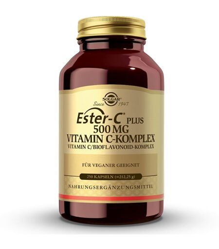 Anwendungsgebiet von Solgar Ester-C Plus 500 mg KapselnDer Körper kann selbst kein Vitamin C bilden, deshalb ist es besonders wichtig, das Vitamin über die Nahrung aufzunehmen. Solgar Ester-C Plus 500 mg Kapseln ist ein patentiertes, annähernd pH-neutrales und magenschonendes Vitamin C mit einem Plus an natürlichem, pflanzlichem Vitamin C aus Acerola-Extrakt und Hagenbutten-Pulver. Die Hagebutte und die Acerola-Kirsche sind von Natur aus sehr reich an Vitamin C und haben dadurch eine antioxidative Wirkung.Wirkstoffe / Inhaltsstoffe / ZutatenZutaten von Solgar Ester-C Plus 500 mg Kapseln: Vitamin C (Ester-C®2, Calcium-L-Ascorbat), Kapselhülle (Hydroxypropylmethylcellulose), Citrusbioflavonoide, Trennmittel (Magnesiumstearat, Siliciumdioxid), Hagebuttenpulver (Rosa canina), Acerola-Extrakt (Malpighia glabra), RutinGegenanzeigenBei bekannter Überempfindlichkeit gegenüber einen der oben genannten Inhaltsstoffe sollte dieses Produkt nicht angewendet werden.DosierungVerzehrempfehlung von Solgar Ester-C Plus 500 mg Kapseln: Eine bis max. zwei Kapseln pro Tag zu den Mahlzeiten einnehmen. HinweiseNahrungsergänzungsmittel stellen keinen Ersatz für eine abwechslungsreiche Ernährung dar. Eine ausgewogene Ernährung und gesunde Lebensweise sind wichtig. Die empfohlene tägliche Verzehrmenge sollte nicht überschritten werden. Außerhalb der Reichweite von kleinen Kindern aufbewahren. Kühl und trocken lagern. Solgar Ester-C Plus 500 mg Kapseln können in Ihrer Versandapotheke www.juvalis.de erworben werden. ...