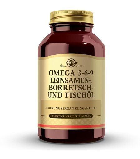 Anwendungsgebiet von Solgar Omega 3-6-9 Kapseln Hochwertige Kombination für Ihre GesundheitDie ungesättigten Omega-3-Fettsäuren EPA und DHA können auf vielfältige Weise zu Ihrem Wohlbefinden beitragen. Gemeinsam unterstützen sie eine normale Herzfunktion und helfen dabei, einen normalen Cholesterinspiegel aufrechtzuerhalten. Darüber hinaus trägt DHA zur Erhaltung einer normalen Gehirnfunktion sowie einer gesunden Sehkraft bei. Diese wertvollen Fettsäuren finden sich in fettreichen Meeresfischen wie Thunfisch, Makrele oder Hering.Auch über pflanzliche Öle – wie Lein-, Walnuss- oder Hanföl – können Sie Ihrem Körper Alpha-Linolensäure zuführen, die als Vorstufe zu EPA und DHA dient.Unser Produkt Omega 3-6-9 bietet Ihnen eine hochwertige Kombination ungesättigter Omega-3-, -6- und -9-Fettsäuren aus natürlichen Quellen. Das enthaltene Borretschöl ist besonders reich an Omega-6-Fettsäuren – insbesondere Gamma-Linolensäure und Linolsäure – und liefert zudem wertvolle Omega-9-Fettsäuren (Ölsäure). Leinsamenöl vereint alle drei Fettsäuren in Form von Alpha-Linolensäure, Linolsäure und Ölsäure. Ergänzend sorgt das Fischöl aus Kaltwasserfischen für eine ausgezeichnete Versorgung mit den wichtigen Omega-3-Fettsäuren EPA und DHA. Benefits DHATrägt zur Erhaltung einer normalen Gehirnfunktion beiTrägt zur Erhaltung normaler Sehkraft bei EPA & DHATragen zu einer normalen Herzfunktion bei LinolsäureTrägt zur Aufrechterhaltung eines normalen Cholesterinspiegels im Blut beiWirkstoffe / Inhaltsstoffe / ZutatenZutaten von Solgar Omega 3-6-9 Kapseln:Leinsamenöl (Linum usitatissimum), Borretschöl (Borago officinalis), Fischöl, Gelatine (Rind), Feuchthaltemittel Glycerin, Antioxidationsmittel gemischte Tocopherole.Inhalt pro Tagesportion(3 Softgel-Kapseln)MengeOmega-3-Fettsäuren davon: Alpha-Linolensäure585 mg davon: Eicosapentaensäure (EPA)344 mg davon: Docosahexaensäure (DHA)221 mgOm ...