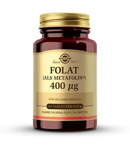 Anwendungsgebiet von Solgar Folat Metafolin 400 mg TablettenFolsäure trägt zum Wachstum des mütterlichen Gewebes während der Schwangerschaft und zur normalen Blut- sowie Zellbildung bei. Es unterstützt die normale Funktion des Immunsystems und kann sogar Müdigkeit verringern. Als Vitamin B₉ zählt sie zu den B-Vitaminen, die gemeinsam dafür sorgen, dass Psyche und Geist harmonisch zusammenarbeiten. Besonders die Kombination mit Vitamin B₆ und B₃ ist wichtig – hat man davon zu wenig, kann nicht so viel Serotonin produziert werden. Solgar Folat Metafolin 400 mg Tabletten enthält Metafolin®, die bereits aktivierte Form 5-MTHF, die auch auf natürliche Weise vorkommt und direkt bioverfügbar ist. Wirkstoffe / Inhaltsstoffe / ZutatenZutaten von Solgar Folat Metafolin 400 mg Tabletten: Füllstoffe (Mannitol, Mikrokristalline Cellulose), Trennmittel (Stearinsäure, Siliciumdioxid, Magnesiumstearat), Stabilisator Vernetzte Natriumcarboxymethylcellulose, Calcium-L-MethylfolatGegenanzeigenBei bekannter Überempfindlichkeit gegenüber einen der oben genannten Inhaltsstoffe sollte dieses Produkt nicht angewendet werden.DosierungVerzehrempfehlung von Solgar Folat Metafolin 400 mg Tabletten: Eine Tablette pro Tag zu einer Mahlzeit einnehmen.HinweiseNahrungsergänzungsmittel stellen keinen Ersatz für eine abwechslungsreiche Ernährung dar. Eine ausgewogene Ernährung und gesunde Lebensweise sind wichtig. Die empfohlene tägliche Verzehrmenge sollte nicht überschritten werden. Außerhalb der Reichweite von kleinen Kindern aufbewahren. Kühl und trocken lagern. Solgar Folat Metafolin 400 mg Tabletten können in Ihrer Versandapotheke www.juvalis.de erworben werden. ...