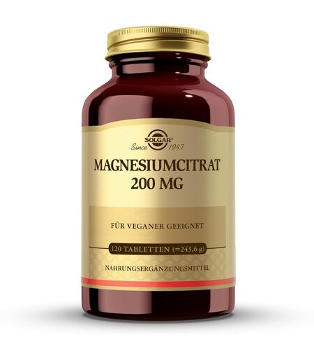 Anwendungsgebiet von Solgar Magnesium Citrat 200 mg TablettenMagnesium unterstützt eine normale Eiweißsynthese, leistet also einen Beitrag beim Energiestoffwechsel, genauer gesagt beim Abbau und der Verwertung von Kohlenhydraten und Proteinen. Zusätzlich unterstützt der Mineralstoff den Elektrolythaushalt und ist wichtig für die Aufrechterhaltung und Stabilisierung der Zellmembran, ist also auch für die Muskelfunktion unentbehrlich. Durch die Stabilisierung von Zellmembranen kann Magnesium die körpereigene Sensibilität gegen Stresshormone dämpfen. So unterstützt Magnesium das Nervensystem und eine ausgeglichene psychische Funktion. Solgar Magnesium Citrat 200 mg Tabletten enthält Magnesiumcitrat, eine organisch gebundene Form von Magnesium, die sehr gut aufgenommen werden kann und deshalb über eine hohe Bioverfügbarkeit verfügt.Wirkstoffe / Inhaltsstoffe / ZutatenZutaten von Solgar Magnesium Citrat 200 mg Tabletten: Magnesiumcitrat, Füllstoffe (Mikrokristalline Cellulose, Dicalciumphosphat), Trennmittel (Siliciumdioxid, Magnesiumstearat), Überzugsmittel (Hydroxypropylmethylcellulose, Hydroxypropylcellulose, Glycerin), Emulgator Natrium-CarboxymethylcelluloseGegenanzeigenBei bekannter Überempfindlichkeit gegenüber einen der oben genannten Inhaltsstoffe sollte dieses Produkt nicht angewendet werden.DosierungVerzehrempfehlung von Solgar Magnesium Citrat 200 mg Tabletten: Eine Tablette pro Tag zu einer Mahlzeit einnehmen.HinweiseNahrungsergänzungsmittel stellen keinen Ersatz für eine abwechslungsreiche Ernährung dar. Eine ausgewogene Ernährung und gesunde Lebensweise sind wichtig. Die empfohlene tägliche Verzehrmenge sollte nicht überschritten werden. Außerhalb der Reichweite von kleinen Kindern aufbewahren. Kühl und trocken lagern. Solgar Magnesium Citrat 200 mg Tabletten können in Ihrer Versandapotheke www.juvalis.de erworben werden. ...
