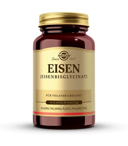 Anwendungsgebiet von Solgar Eisenbisglycinat Kapseln Eisenstarkes FrauseinIhr Eisenbedarf als junge Frau ist deutlich höher als der von Männern. Dafür gibt es verschiedene Gründe – etwa die Regelblutung, Phasen der Schwangerschaft oder die Stillzeit. In diesen Zeiten verlangt Ihr Körper nach etwas mehr Eisen.Dieses Spurenelement kann Ihnen auch eine große Hilfe sein, wenn Sie sich häufig müde oder energielos fühlen, denn es trägt zum Energiestoffwechsel, zum Sauerstofftransport im Körper sowie zur Verringerung von Müdigkeit und Ermüdung bei. Sowohl Ihr Kopf als auch Ihr Körper profitieren von einer ausreichenden Eisenversorgung, da der Mineralstoff ebenfalls eine wichtige Rolle für die kognitive Funktion und das Immunsystem spielt.Hochwertiges Eisen nehmen Sie vor allem über Fleisch zu sich. Wenn Sie sich vegetarisch oder vegan ernähren, müssen Sie auf eisenreiche pflanzliche Lebensmittel setzen. Pflanzliches Eisen unterscheidet sich vom tierischen – es kann nicht direkt vom Körper aufgenommen, sondern muss zunächst umgewandelt werden. Aus diesem Grund greifen viele Vegetarierinnen und Veganerinnen auf Nahrungsergänzungsmittel zurück.Unsere fortschrittliche und patentierte Form von Ferrochel® 2 mit einer Dosierung von 20 mg Eisen aus der organischen Verbindung Eisenbisglycinat pro Kapsel gilt als besonders gut verträglich. BenefitsEisenTrägt zu einer normalen kognitiven Funktion beiTrägt zu einem normalen Energiestoffwechsel beiTrägt zur normalen Bildung von roten Blutkörperchen und Hämoglobin beiTrägt zu einem normalen Sauerstofftransport im Körper beiTrägt zu einer normalen Funktion des Immunsystems beiTrägt zur Verringerung von Müdigkeit und Ermüdung beiHat eine Funktion bei der ZellteilungWirkstoffe / Inhaltsstoffe / ZutatenZutaten von Solgar Eisenbisglycinat Kapseln:Füllstoffe (Mikrokristalline Cellulose, Citronensäure, Maltodextrin), Kapselhülle (Hydroxypropylmethylcellulose), Eisenbisglycinat, Trennmittel ...