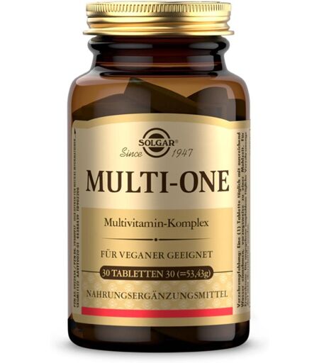 Anwendungsgebiet von Solgar Multi-One Multivitamin-Komplex Tabletten Für die tägliche MikronährstoffversorgungMikronährstoffe sind entscheidend für die Gesundheit, da sie grundlegende Funktionen und Stoffwechselprozesse im Körper unterstützen.Sie spielen eine entscheidende Rolle in verschiedenen physiologischen Prozessen. So unterstützt beispielsweise das enthaltene Vitamin C die Immunfunktion. Die B-Vitamine greifen dem Energiestoffwechsel unter die Arme, während Magnesium und Mangan zum Erhalt normaler Knochen beitragen. Für die Zellteilung enthält das Produkt unter anderem Vitamin D und Eisen. Das Multi-one von Solgar® bietet eine praktische Lösung als wertvolle Ergänzung zur täglichen Ernährung. Die One-a-Day-Formel von Solgar® vereint in nur einer Tablette sorgfältig ausgewählte Mikronährstoffe, darunter 12 essenziellen Vitamine, Mineralstoffe und Spurenelemente.Abgerundet wird die Formel durch wertvolle Pflanzenstoffe wie Acerola, Hagebutte und Brunnenkresse. Das Multi-one ist perfekt für einen modernen Lebensstil und lässt sich mühelos mit nur einer Tablette pro Tag in den Alltag integrieren. BenefitsMultivitamin-Komplex für die tägliche MikronährstoffversorgungEnthält 12 essenzielle Vitamine sowie 8 Spurenelemente und 2 MineralstoffeAbgerundet mit Pflanzenstoffen, darunter Acerola, Hagebutte und Brunnenkresse„One a Day“-Formel: nur eine Tablette täglich100 % veganWirkstoffe / Inhaltsstoffe / ZutatenZutaten von Solgar Multi-One Multivitamin-Komplex Tabletten:Füllstoffe (mikrokristalline Cellulose, Mannitol), Calcium (Calciumcarbonat, Calciumbisglycinat), Magnesium (Magnesiumoxid, Magnesiumbisglycinat), Ascorbinsäure, Citrusbioflavonoide, Stabilisatoren (Hydroxypropylmethylcellulose, vernetzter Cellulosegummi), konzentrierter Rettich, Schwarze Johannisbeere, Apfel, Spirulina-Extrakt, Cholinbitartrat, Beta-Carotin (aus natürlicher Quelle), Inositol, Trennmittel (pflanzliche Stearinsäure, Siliziumdioxid, Magnesiums ...