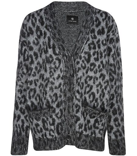 Damen Cardigan aus hochwertigem Alpakawollmix Langarm Überschnittene Schultern Schließt mit Knopfleiste Glattstrick Ärmelenden, Ausschnitt und Saum mit elastischen Rippbündchen Aufgesetzte Taschen vorne seitlich Allover Leoprint Passform: oversize, gerader, weiter Schnitt, fällt locker Farbbezeichnung: Grey Leopard Material: 50% Alpaka, 50% recyceltes Polyamid ...
