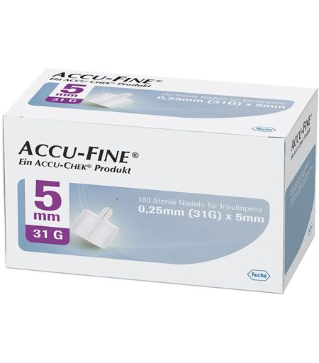 Nadeldurchmesser/-länge0,25 mm (31G) /5 mmZum Glück können Injektionen schmerzarm sein! Durch den Feinschliff und die Gleitbeschichtung sorgen Accu-Fine Pen-Nadeln für eine schmerzarme Insulinabgabe – und bieten Ihnen so die Qualität, die Sie von Accu-Chek gewohnt sind. Die Vorteile von Accu-Fine auf einen Blick: Schmerzarm durch den Feinschliff und die Gleitbeschichtung Für die gängigen Pens geeignet Erhältlich in den relevanten Längen 4 mm, 5 mm und 8 mm Die Verschlusskappe bietet Sterilität und erleichtert das Auf- und Abschrauben der Nadel Die Schutzkappe der Nadel schützt die Nadel bis zur Injektion Kompatibel mit folgenden Insulinpens Sanofi ClikSTAR, SoloSTAR, Lyxumia Pen, JuniorSTAR, AIRSTAR Lilly KwikPEN, HumaPen Memoir, HumaPen, Savvio, HumaPen Luxura, HumaPen Luxura HD Novo Nordisk FlexPen, NovoPen 3, NovoPen Junior, NovoPen 4, NovoPen Echo, Victoza Pen, InnoLet, FlexTouch Astrea Zeneca Byetta 5 mcg, Byetta 10 µg Ypsomed Ypsomed Owen Mumford Autopen Classic, Autopen 24 Berlin Chemie BerliPen Areo ...