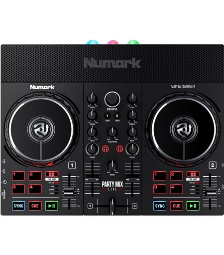 Jede Zeit ist Partyzeit!: Ob DJ-Einsteiger oder professioneller Veteran, der Party Mix Live DJ-Controller hat alle Funktionen, die du brauchst, um die Party imNumark-Stil zu rocken! Verbinde einfach deinen Party Mix Live mit deinem Laptop oder deinem mobilen Gerät und mixe dich durch deineultimative Party-Playlist. Die eingebauten Lautsprecher füllen den Raum mit dynamischem Sound, und die integrierten LED-Lichtersorgenfür eine unvergessliche, farbenfrohe Lightshow, die Beat-synchron abläuf! Deine Playlist auf Abruf!: Die Zeiten, in denen DJs eine riesige Musiksammlung besitzen mussten, sind vorbei. Mit Party Mix Live hast du jeden heißen Trackwortwörtlich zur Hand, dank der enthaltenen Serato DJ Lite Software mit Zugriff auf deine bestehende Bibliothek oder auf Mainstream-Streaming-Plattformen, inklusive TIDAL, Beatport Link, Beatsource Link und SoundCloud GO Kein Laptop? Kein Problem! Party Mix Live ist kompatibel mit beliebten mobilen DJ-Apps, wie djay PRO AI von Algoriddim. Verbinde einfachdein mobiles Gerät mit Party Mix Live über ein USB Camera Connection Kit (separat erhältlich), und es kann losgehen! Eingebaute Lautsprecher: Mit den eingebauten Lautsprechern ist das Party Mix Live immer bereit für die Action und liefert Stereo-Sound, wo auch immerdichdie Party hinführt! Über den An/Aus-Schalter kannst du die Lautsprecher ausschalten, während du den Mix weiter über deineeigenenKopfhörer hörst – ideal, um privat ein echtes Killer-Set zu erstellen! Lightshow auf Knopfdruck: Lege einfach einen Schalter um, und schon verwandelt Party Mix Live jeden Ort in eine Partyfläche! Mit 3 farbigen LEDs mitflächendeckendenLinsen und 5 Beleuchtungsmodi bietet Party Mix Live eine raumfüllende, Beat-synchrone Lightshow für die ultimative Partystimmung Professionelle DJ-Funktionen: Vollgepackt mit modernsten Funktionen ist Party Mix Live bereit für jedes Szenario, vom Schlafzimmer bis zum DJ-Pult. Vier PerformancePads auf jedem Deck ermöglichen den schnellen Zugriff auf Effekte, Cue-Punkte, Loops oder Samples. Die Tasten für Play, Cue und Syncgeben dir die volle Playback-Kontrolle und schnellen Zugriff auf die automatische Tempoangleichung von Tracks auf jedem Deck für einenperfekt abgestimmten Mix. Mit dem großen Filterregler auf jedem Deck wertest du deinen Mix auf und erschaffst den perfektenÜbergangzwischen Songs, und mit dem Software-anpassbaren Crossfader sorgst du für sanfte Fades in deinem Mix oder für harte Cuts für Scratching. Dank der großen, hochwertigen, berührungsempfindlichen Jogwheels hast du mit Party Mix Live die taktile Kontrolle über deinen Mix: BauePausen, Backspins und sogar Scratching in deine Tracks ein, während du durch deine Party-Playlist voranschreitest. Der äußere Jogwheel-Ring dient als Pitch-Bend, damit du deine Tracks für den perfekten Mix genau abstimmen kannst Mit dem Numark Party Mix Live bist du immer bereit für eine Party, jederzeit und überall! Eingebaute LED-Lightshow, die sich mit der Musiksynchronisiert,... ...