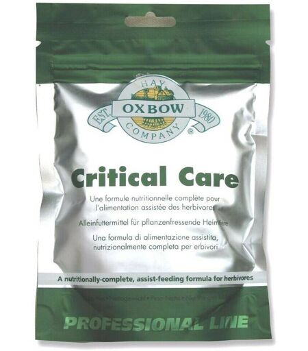 Critical Care® ist ein hochwertiges Futter, das an Pflanzenfresser verabreicht werden kann, die aufgrund von Krankheiten, Operationen oder einem schlechten Ernährungszustand ihre normale Ernährung nicht einnehmen wollen. Dieses speziell formulierte Produkt enthält alle essentiellen Nährstoffe einer Vollwertkost sowie ballaststoffreiches Timothyheu für eine gute Darmphysiologie und -verdauung. Fütterungsempfehlung: Vor Gebrauch gut schütteln. Mischen Sie 1 Teil Critical Care® mit 2 Teilen heißem Wasser zu der gewünschten Konsistenz. Die Wassermenge kann je nach Fütterungsart eingestellt werden. Zusammensetzung Timothy Grass Meal, Soybean Hulls, Soybean Meal, Wheat Germ, Xanthan Gum, Potassium Chloride, Salt, L-Ascorbyl-2-Polyphosphate (Vitamin C), Soybean Oil, Flaxseed, Magnesium Sulfate, Calcium Chloride, Papaya, Pineapple, Cane Molasses, Natural Flavor, DL-Methionine, L-Glutamine, Oat Groats, Wheat Middlings, Sodium Bentonite, Yeast Culture (dehydrated), Fat Product, Hydrolyzed Yeast, Inulin, Mixed Tocopherols (preservative), Choline Chloride, Vitamin E Supplement, Zinc Sulfate, Zine Proteinate, Niacin, Copper Sulfate, d-Calcium Pantothenate, Vitamin A Supplement, Manganous Oxide, Riboflavin Supplement, Biotin, Thiamine Mononitrate, Copper Proteinate, Sodium Selenite, Manganese Proteinate, Pyridoxine Hydrochloride, Folic Acid, Vitamin D3 Supplement, Cobalt Carbonate, Vitamin B12 Supplement, Calcium Iodate, Rosemary Extract ...