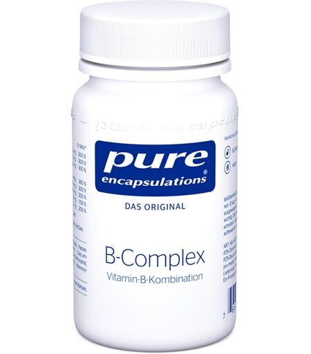 Anwendungsgebiet von Pure Encapsulations B-Complex KapselnDie Aufgaben des Alltags können die Psyche oft herausfordern. B-Vitamine wie B6 und B12 sind dabei ideale Partner für gesunden Nerven. Pure Encapsulations B-Complex Kapseln bietet alle acht B-Vitamine in idealer Dosierung und geprüfter Qualität für eine langfristige Anwendung.Wirkstoffe / Inhaltsstoffe / ZutatenZutaten von Pure Encapsulations B-Complex Kapseln: Füllstoff: mikrokristalline Cellulose, Kapsel: Hydroxypropyl- methylcellulose, Niacinamid, Calciumpantothenat, Pyridoxal-5- Phosphat, Riboflavin-5-Phosphat, Thiamin HCl, Calcium-L-Methyl- folat (Metafolin®), Biotin, Adenosylcobalamin, Methylcobalamin. Inhalt pro Tagesportion (1 Kapsel) Menge Vitamin B 1: 3,3 mg Vitamin B 2 – aktiviert: 4,2 mg Vitamin B 6 – aktiviert: 7 mg Vitamin B 12 (aus Adenosyl- und Methylcobalamin): 12,5 mcg Biotin: 150 mcg Folat (als Metafolin®): 400 mcg Niacin (Vitamin B 3 ): 16 mg Pantothensäure (Vitamin B 5 ): 12 mg Metafolin® ist eine eingetragene Marke der Merck KGaA, Darmstadt, DeutschlandGegenanzeigenBei bekannter Überempfindlichkeit gegenüber einem der oben genannten Inhaltsstoffe sollte dieses Produkt nicht angewendet werden. DosierungVerzehrempfehlung von Pure Encapsulations B-Complex Kapseln: Nehmen Sie pro Tag 1 Kapsel mit ausreichend Flüssigkeit zu einer Mahlzeit ein.HinweiseNahrungsergänzungsmittel stellen keinen Ersatz für abwechslungsreiche Ernährung dar. Eine ausgewogene Ernährung und gesunde Lebensweise sind wichtig. Pure Encapsulations B-Complex Kapseln sollten außerhalb der Reichweite von Kindern aufbewahrt werden. Die täglich empfohlene Verzehrmenge sollte nicht überschritten werden. Nicht über 25 °C aufbewahren. Vor Licht und Feuchtigkeit schützen. Pure Encapsulations B-Complex Kapseln können in Ihrer Versandapotheke www.juvalis.de erworben werden. ...