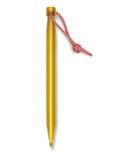 Der V-Peg Hering 10er Pack vereint geringes Gewicht mit hoher Verwindungssteifheit und Stabilität. Gefertigt ist er aus gehärtetem Aluminium. Verwendet werden kann er bei harten und weicheren Böden, in denen er dank der V-Form durchaus eine Menge Zugkraft vertragen kann. Die Form ermöglicht außerdem ein einfaches Einschlagen in harten Boden. Damit man keine Probleme beim Herausziehen bekommt, hat Hilleberg den V-Peg oben mit einer großen Schlaufe versehen. Der ermöglicht das Rausziehen im Winter auch mit Handschuhen relativ bequem. Die goldene Farbe macht ihn leicht erkennbar, so dass am Lagerplatz kein Hering zurückbleibt. ...