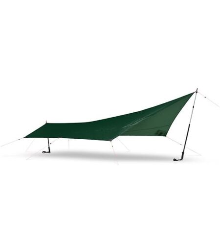 Dank des durchdachten Designs kannst du das fünfeckige Tarp auf verschiedene Weisen aufstellen und dadurch den Wetterschutz individuell an deine Bedürfnisse anpassen. Du kannst das Hilleberg Tarp 5 zum Beispiel mit zwei Ecken am Boden befestigen, um eine geschlossene, schützende Rückwand zu errichten. Die spezielle Form des Tarps macht das Darunterschlüpfen besonders einfach. Das Tarp 5 ist mit vielen Abspannpunkten ausgestattet und kann mit Trekkingstöcken, Aufstellstangen, Ästen oder Paddeln variabel aufgebaut werden. Zusammengepackt hat das Tarp ein Packmaß eines herkömmlichen 1-Liter-Topfs. Mit 3,15 m x 2,15 m Fläche passt du mit deiner Ausrüstung entspannt darunter, und im Notfall kann sich auch eine zweite Person unter das schützende Dach retten. Dank seines kleinen Packmaßes und gerade einmal 316 g Eigengewicht passt das Hilleberg Tarp 5 in wirklich jedes Gepäck, ohne unnötig viel Platz wegzunehmen. Das Tarp ist bereits mit vormontierten Abspannschnüren mit Leinenspannern ausgestattet, der integrierte Packsack sorgt für eine sichere, kompakte Aufbewahrung während des Transportes. Alles in allem ist das Tarp 5 die perfekte Lösung für alle, die einen minimalistischen und doch komfortablen Wetterschutz für ihre Outdoorabenteuer benötigen. Das Tarp schützt zuverlässig vor Wind und Regen, lässt sich auf verschiedene Weisen aufbauen und nimmt kaum Platz im Gepäck ein – genau richtig für deinen nächsten Trip in die Natur. ...
