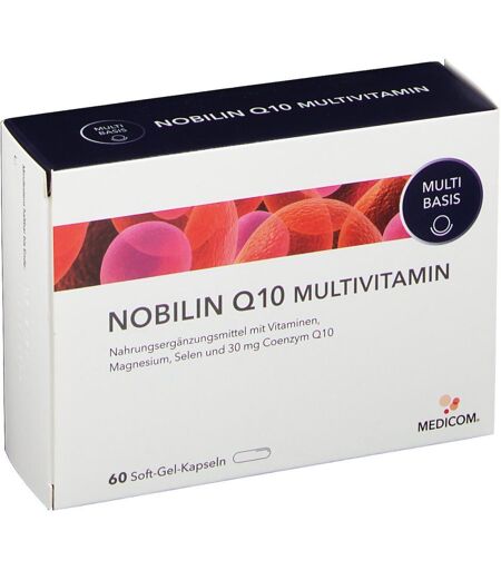 Nahrungsergänzungsmittel sind kein Ersatz für eine ausgewogene und abwechslungsreiche Ernährung und eine gesunde Lebensweise. Multivitalstoff-Präparat mit 14 hochwertigen VitalstoffenZutaten:Pflanzliche Öle und Fette (Sonnenblumen, Kokosnuss, Palmkerne), teilgehärtet; Gelatine; Magnesiumcarbonat; Calcium-L-ascorbat; Feuchthaltemittel: Glycerin, Sorbit; RRR-alpha-Tocopherol; Nicotinamid; Coenzym Q10 (1,8 %); Calciumpantothenat; Emulgator: Sojalecithine ; Beta-Carotin; Cyanocobalamin; Pyridoxinhydrochlorid; Riboflavin; Thiaminmononitrat; Folsäure; Biotin; Natriumselenit; Farbstoff: Eisenoxide und -hydroxide.Nährwertangabenpro Kapselpro 100 KapselnBrennwert30 kJ/ 7 kcal1778 kJ/ 425 kcalFett588 mg35 gKohlenhydrate164 mg10 gEiweiß240 mg14 gBroteinheiten0,01 BE0,8 BEZusammensetzungTagesdosis (1 Kapsel) enthält:Prozent des Referenzwertes pro Tagesdosis:Vitamin C150 mg188 %*Magnesium60 mg16 %*Vitamin E36 mg a-TE300 %*Niacin34 mg NE213 %Coenzym Q1030 mg-Pantothensäure16 mg267 %*Beta-Carotin4,8 gentspricht Vitamin A(= 800 µg RE)(100 %*)Vitamin B63,4 mg243 %*Vitamin B23,2 mg229 %*Vitamin B12,4 mg218 %*Folsäure400 µg200 %*Biotin200 µg400 %*Selen20 µg36 %*Vitamin B129 µg360 %**nach EU-Richtlinie über die Nährwertkennzeichnung von LebensmittelnVerzehrempfehlung:Verzehren Sie 1-mal täglich eine Kapsel mit ausreichend Flüssigkeit zu den Mahlzeiten.Hinweis:NOBILIN Q10 MULTIVITAMIN enthält nur 0,01 BE pro Kapsel. NOBILIN Q10 MULTIVITAMIN ist darüber hinaus auch gluten- und laktosefrei.Aufbewahrung:Lagern Sie NOBILIN Q10 MULTIVITAMIN nicht über Raumtemperatur (bis 25°C) und bewahren Sie die Kapseln trocken und lichtgeschützt in der Packung auf. Bitte außerhalb der Reichweite von kleinen Kindern lagern.Nettofüllmenge:60 Kapseln à 1.680 mg = 101 gHerstelledaten:Medicom Pharma GmbHSedemünder 231832 Springe ...