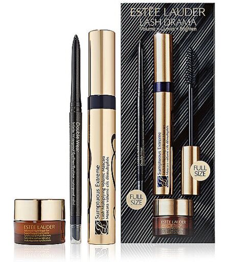 Bring deine Wimpern auf das nächste Level. Mit diesen Essentials wirken die Augen strahlender, größer und verführerischer. Mit der Zeit reduziert Advanced Night Repair Eye Supercharged Gel-Crème sichtbar Linien, Falten, Schwellungen und dunkle Augenringe. Sorge für einen intensiven Blick – ob mit präziser Definition oder verführerischem Smokey-Effekt. Double Wear Waterproof Eyeliner ist wasserfest sowie wisch-, schweiß-, hitze- und feuchtigkeitsresistent. Sumptuous Extreme Mascara sorgt für einen False-Lash-Effekt. Die Wimpern wirken sofort vervielfacht, verlängert und verdichtet. CREATING THE FUTURE OF BEAUTY TOGETHER. Bitte recyceln Sie diesen Karton. Diese limitierte Kollektion enthält: Advanced Night Repair Eye Supercharged Gel-Crème Synchronized Multi-Recovery, Luxus-Reisegröße (.17 oz./5ml) Double Wear Infinite Waterproof Eyeliner, Originalgröße (.01 oz./.35g) in Blackened Onyx Sumptuous Extreme Lash Multiplying Volume Mascara, Originalgröße (.27 oz./8ml) Anwendung:  Schritt 1: Tragen Sie Advanced Night Repair Eye Supercharged Gel-Crème morgens und abends sanft um die Augenpartie auf. Schritt 2: Betonen Sie die Augen mit Double Wear Waterproof Eyeliner nach Wunsch. Für einen weicheren oder verwischten Look schnell verblenden, bevor er fixiert. Schritt 3: Tragen Sie Sumptuous Extreme Mascara auf obere und untere Wimpern auf – für einen False-Lash-Effekt. Ingredients: Water Aqua Eau, Stearic Acid, Myrica Cerifera (bayberry) Fruit Wax, Sucrose Polybehenate, Polyvinyl Acetate, Polyisobutene, Paraffin, Aminomethyl Propanediol, Isostearic Acid, Kaolin, Panthenol, Pantethine, Copernicia Cerifera (carnauba) Wax Copernicia Cerifera Cera Cire De Carnauba, Hydroxyethylcellulose, Cholesterol, Hydrogenated Olive Oil, Vp/eicosene Copolymer, Olea Europaea (olive) Fruit Oil, Olea Europaea (olive) Oil Unsaponifiables, Sodium Levulinate, Sodium Polyacrylate, Rosmarinus Officinalis (rosemary) Extract, Simethicone, Polyester-5, Pvp, Silica, Caprylyl Glycol, Hexylene Glycol, Nylon-6, Laureth-4, Nylon-66, Synthetic Fluorphlogopite, Potassium Sorbate, Phenoxyethanol, [+/- Mica, Titanium Dioxide (ci 77891), Iron Oxides (ci 77491), Iron Oxides (ci 77492), Iron Oxides (ci 77499), Black 2 (ci 77266), Ferric Ferrocyanide (ci 77510), Yellow 5 Lake (ci 19140), Chromium Oxide Greens (ci 77288), Chromium Hydroxide Green (ci 77289), Bismuth Oxychloride (ci 77163), Ultramarines (ci 77007), Yellow 5 (ci 19140), Blue 1 Lake (ci 42090), Blue 1 (ci 42090)] <ILN49039> ...